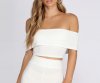 Get a fresh look with this must have crop top! It features an off the shoulder neckline, a fold over accent, and a cropped and fitted look. The top is composed of a knit fabric that offers moderate stretch.