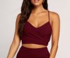 Break the ice with this head turning top! It features a sleeveless bodice, a V neckline, adjustable spaghetti straps, a cropped hem and a tie strap accents. Top is composed of a lined lightweight textured woven fabric that offers a relaxed fit with minimal stretch. Be sure to pick up the matching pants to complete your look!