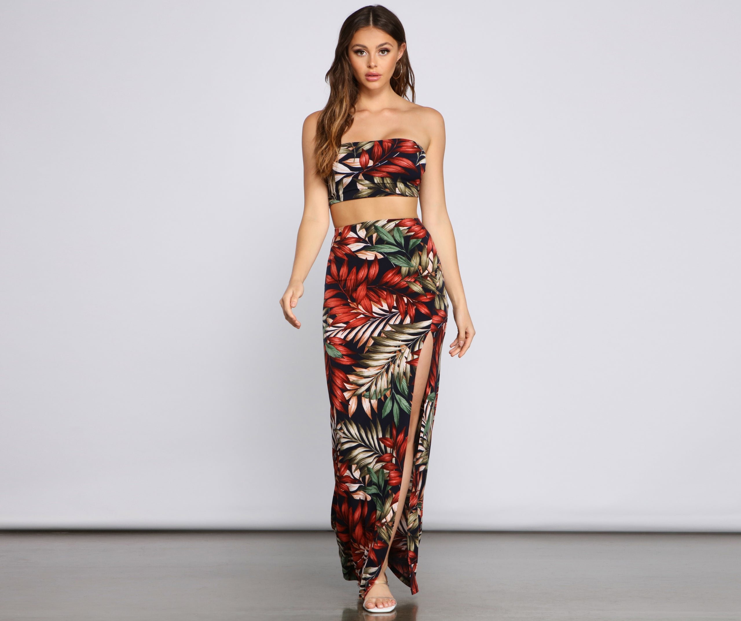 Get set for the tropics in this top that will transport you to an island fantasy. This vacation-ready tube top features a straight neckline and a tropical palm-leaf print. Complete your Insta-ready look with the matching skirt and