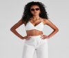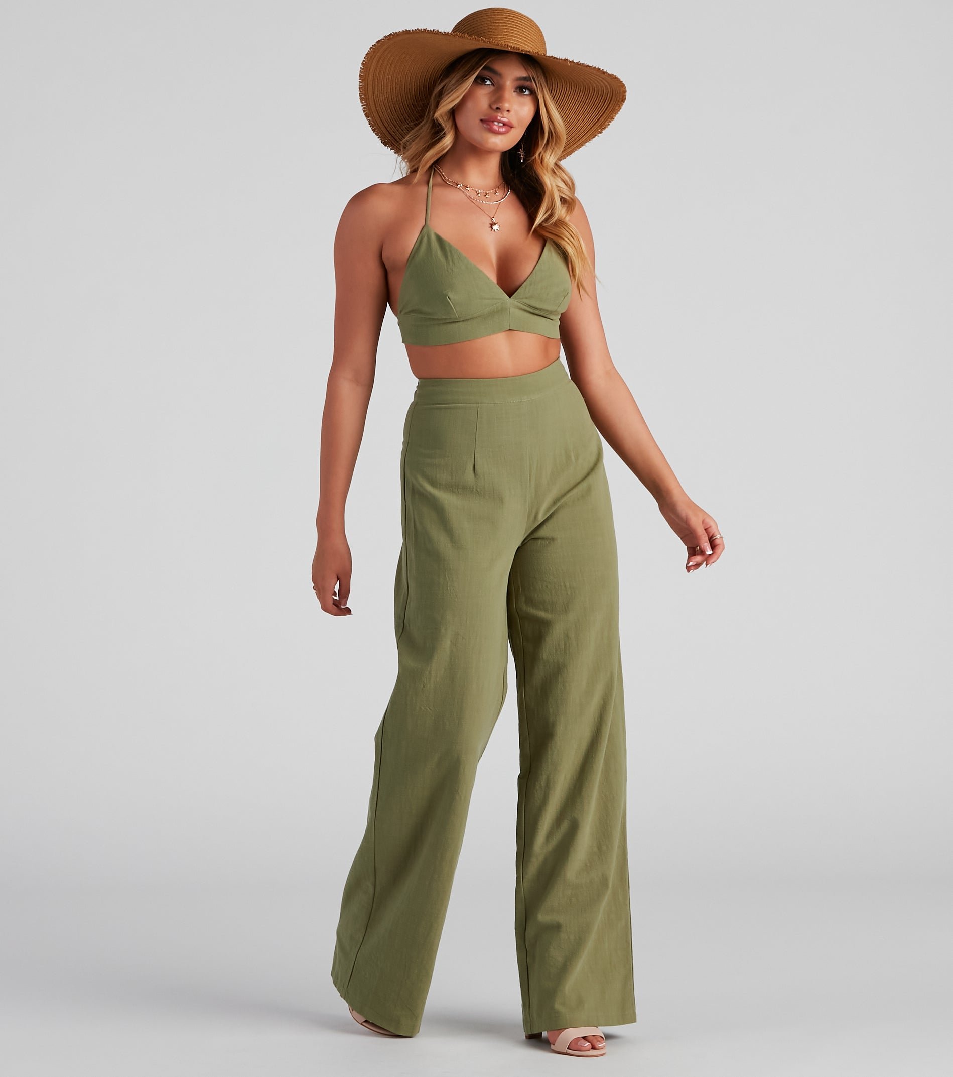 Get whisked away in a crop top that will have you channeling those vacay vibes! The top features a halter neck with a sweetheart bust, neck tie, back ties, and a cropped hem. Complete look with the matching high waist pants and wedges.?