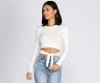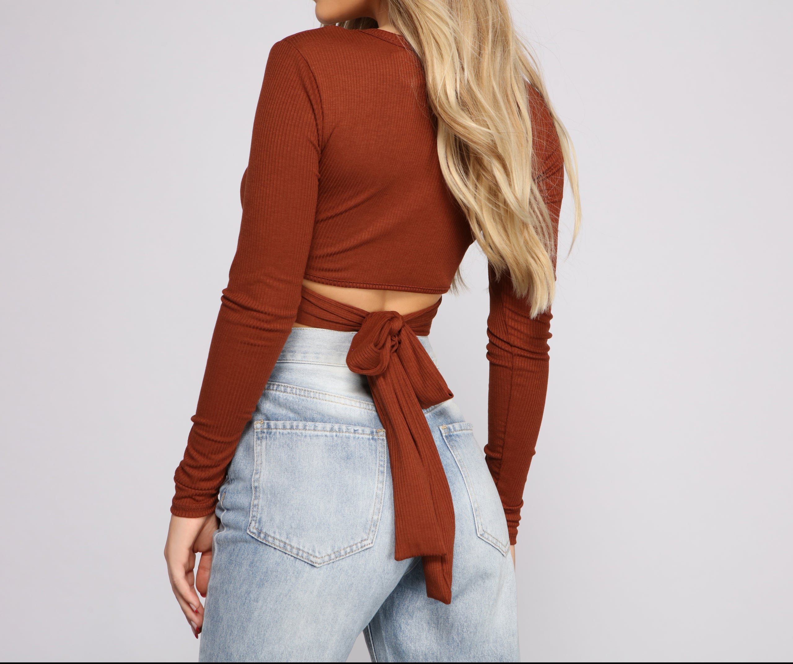 Break through your everyday look with something unique like this wrap waist crop top! It features a crew neckline, long sleeves, and a form-fitting style with a wrap design that can tie at the front and the back. Pair this top with