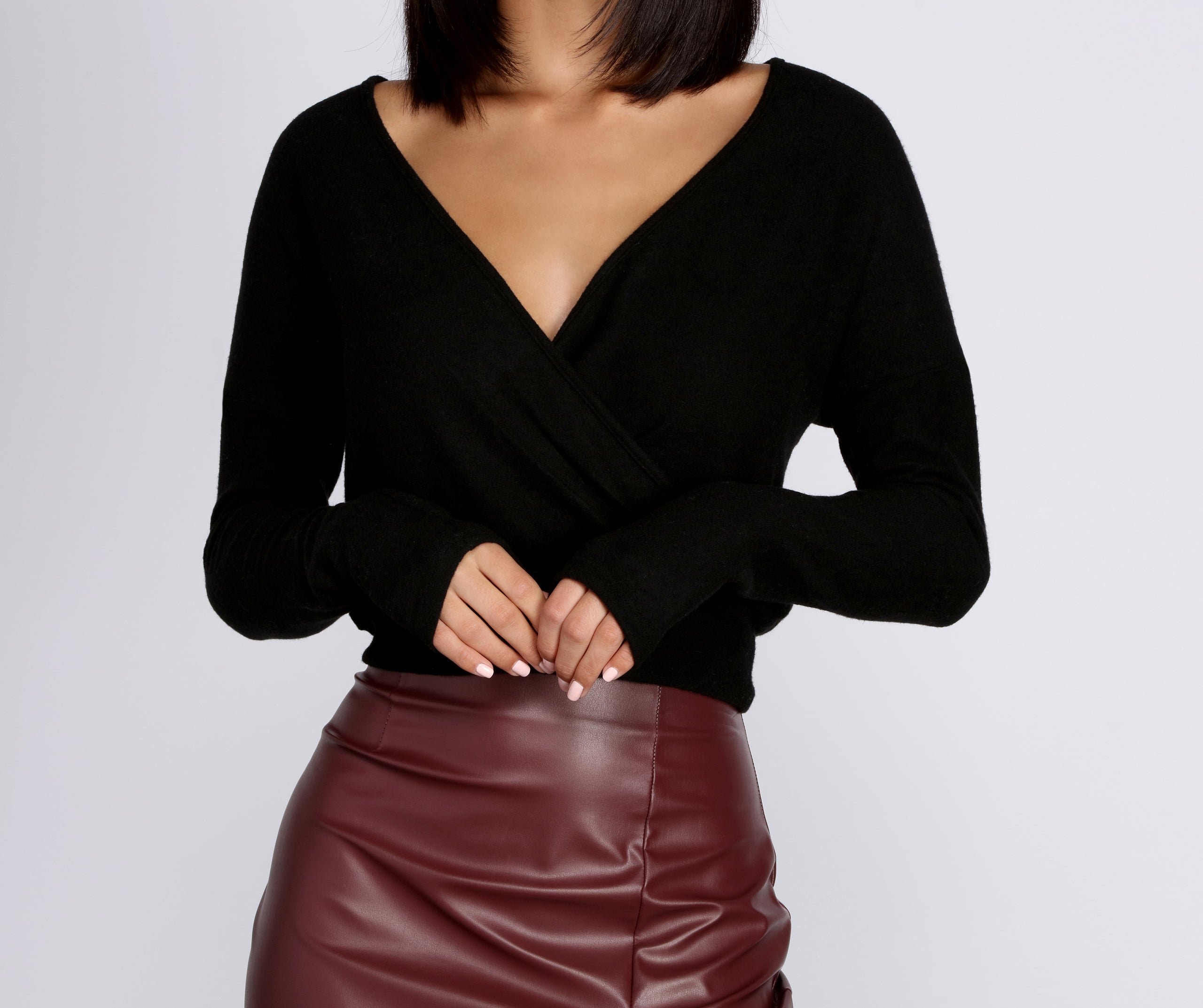 Wrap yourself in this cozy find to complete your look! It features a plunging wrap V neckline, long sleeves and a cropped hem with a wide waistband. Top is composed of a brushed knit fabric that offers a relaxed fit with a moderate stretch.