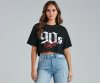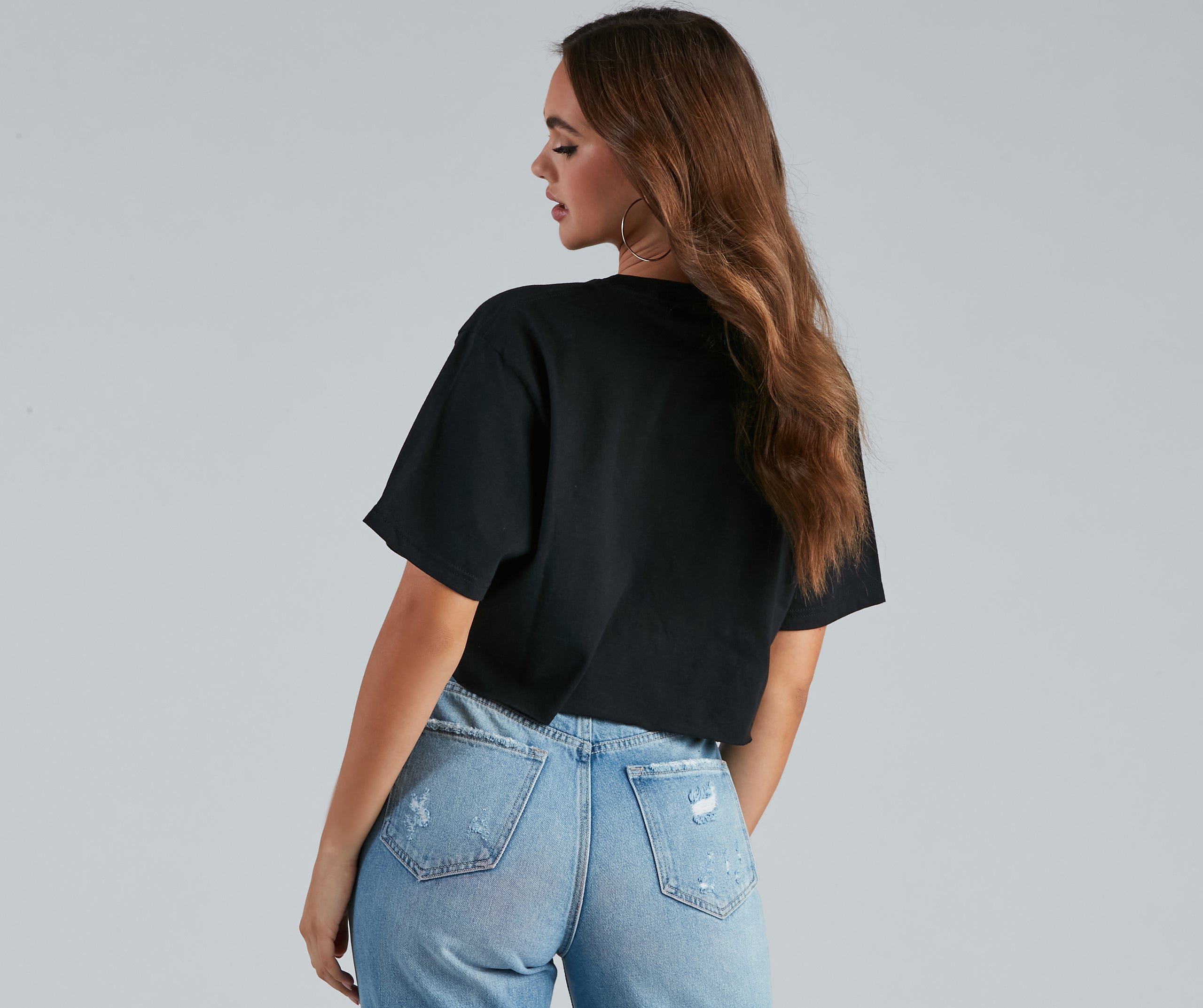 Throw it back to the 90's babe in this graphic crop tee! It features short sleeves, a crew neck, and a boxy silhouette with a raw hem. Complete the look in boyfriend