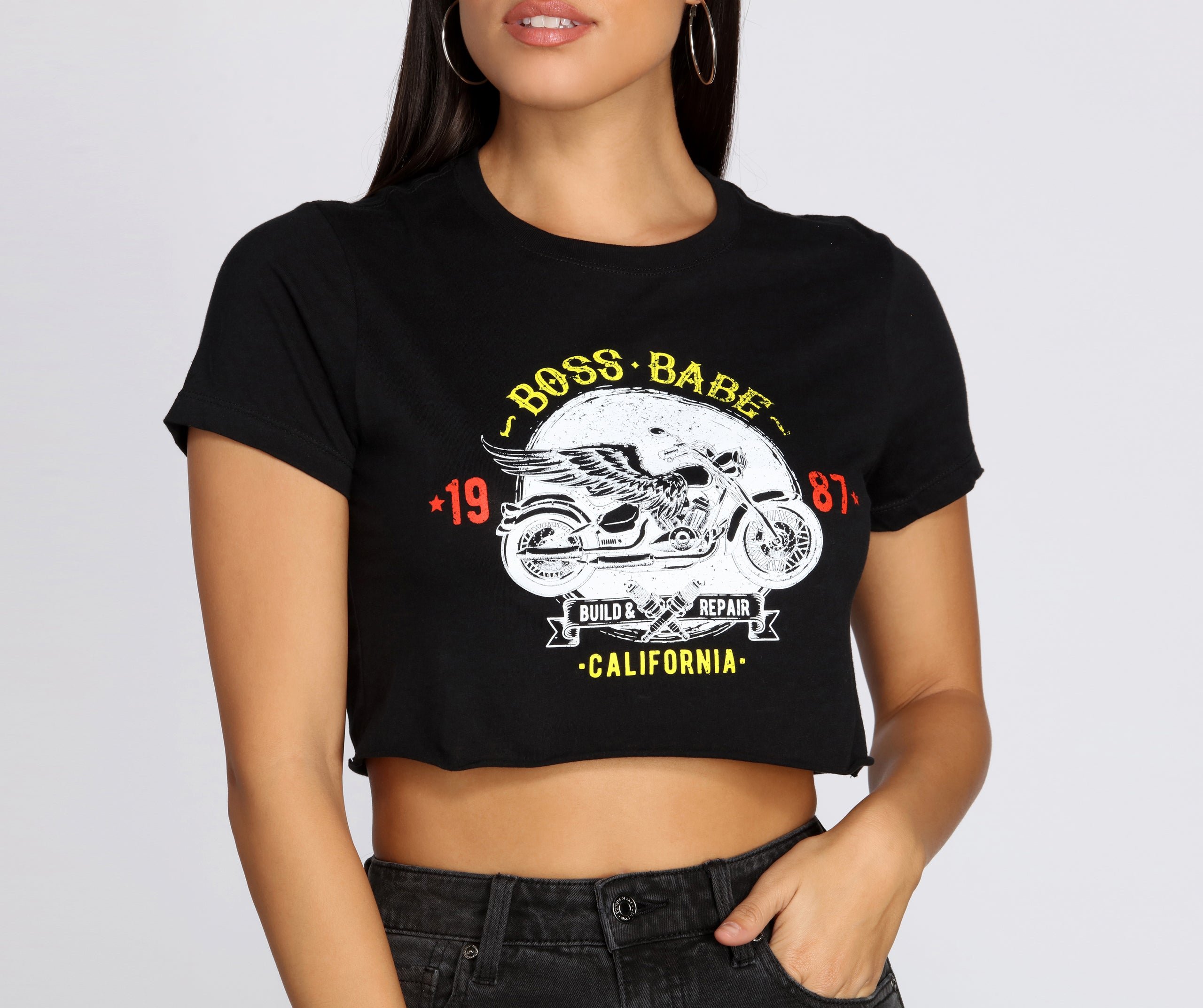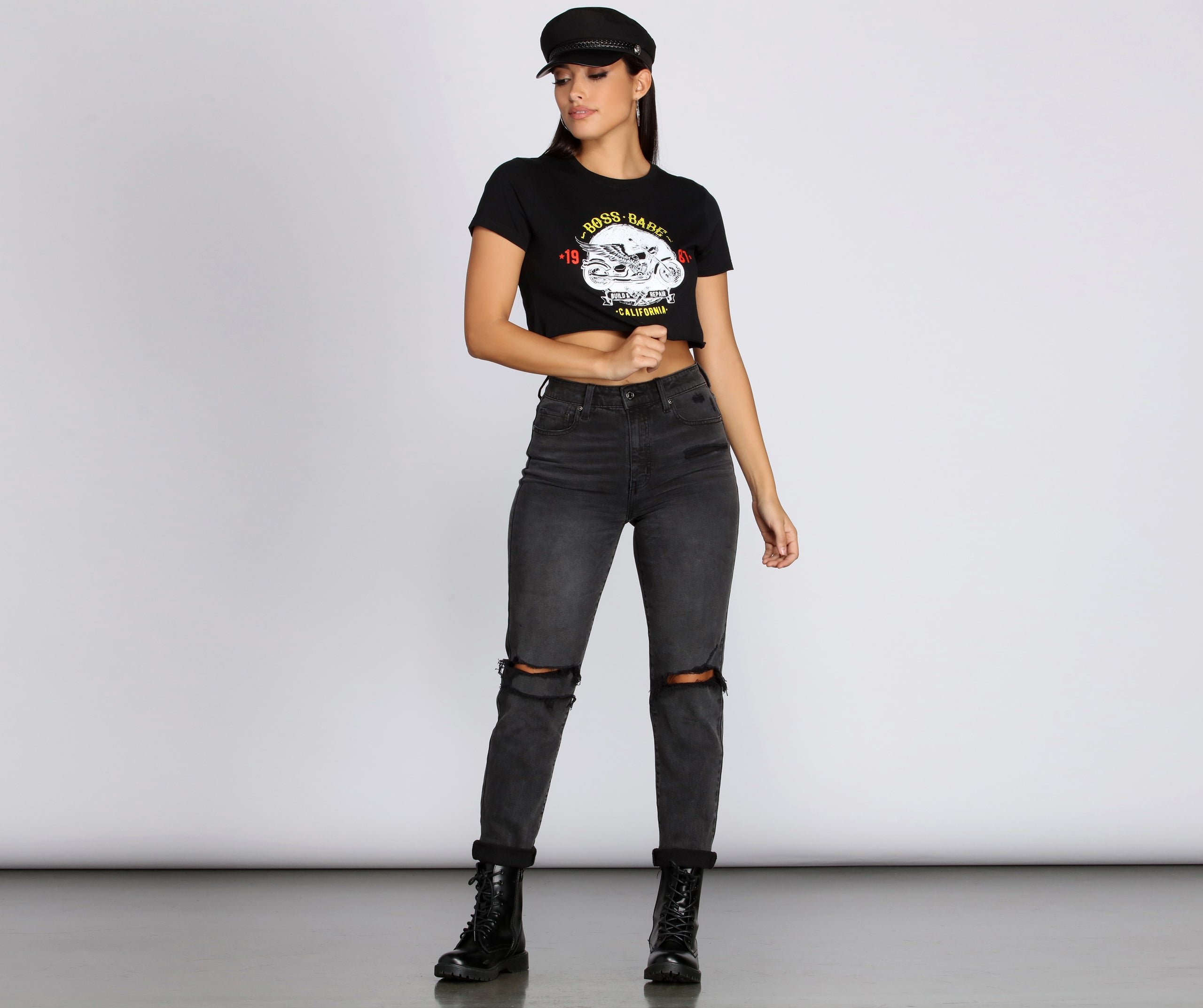 Show em whose boss babe! This tee is designed with a crew neckline, short sleeves, and a short cropped hem that hits at the rib area. The crop top has a California style graphic that showcases a contrasting vintage moto design. What we love about this crop is that it pairs well with all of our high waisted bottoms!