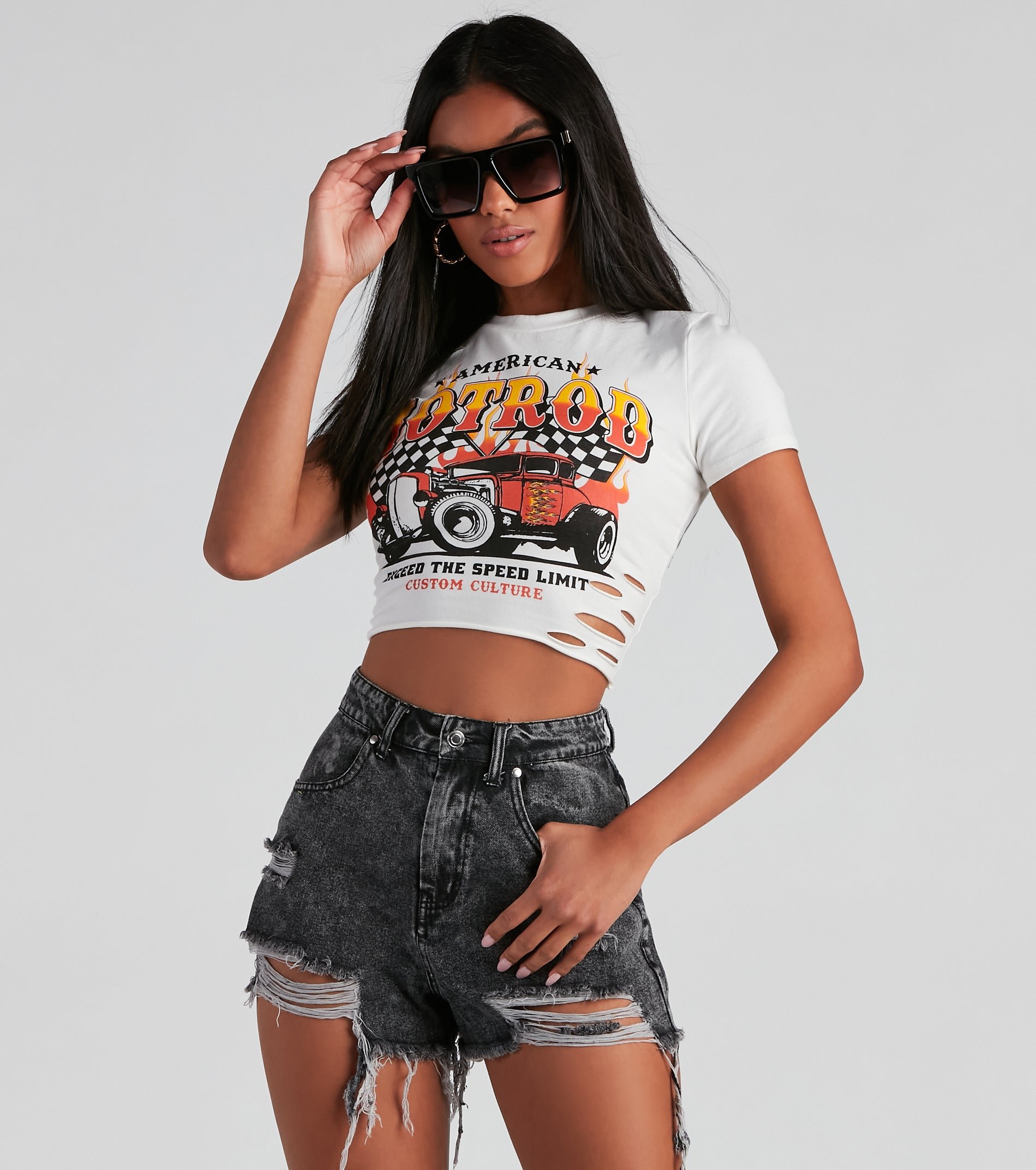 Set off in a top that was made to speed! The top features a crew neckline, short sleeves, slashed detailing, a graphic that reads: "American Hotrod", checkered flags, an image of a vintage car, and a cropped hem. The top is composed of a cotton knit fabric that offers a form hugging fit with a moderate stretch. Complete look with cutoff shorts and
