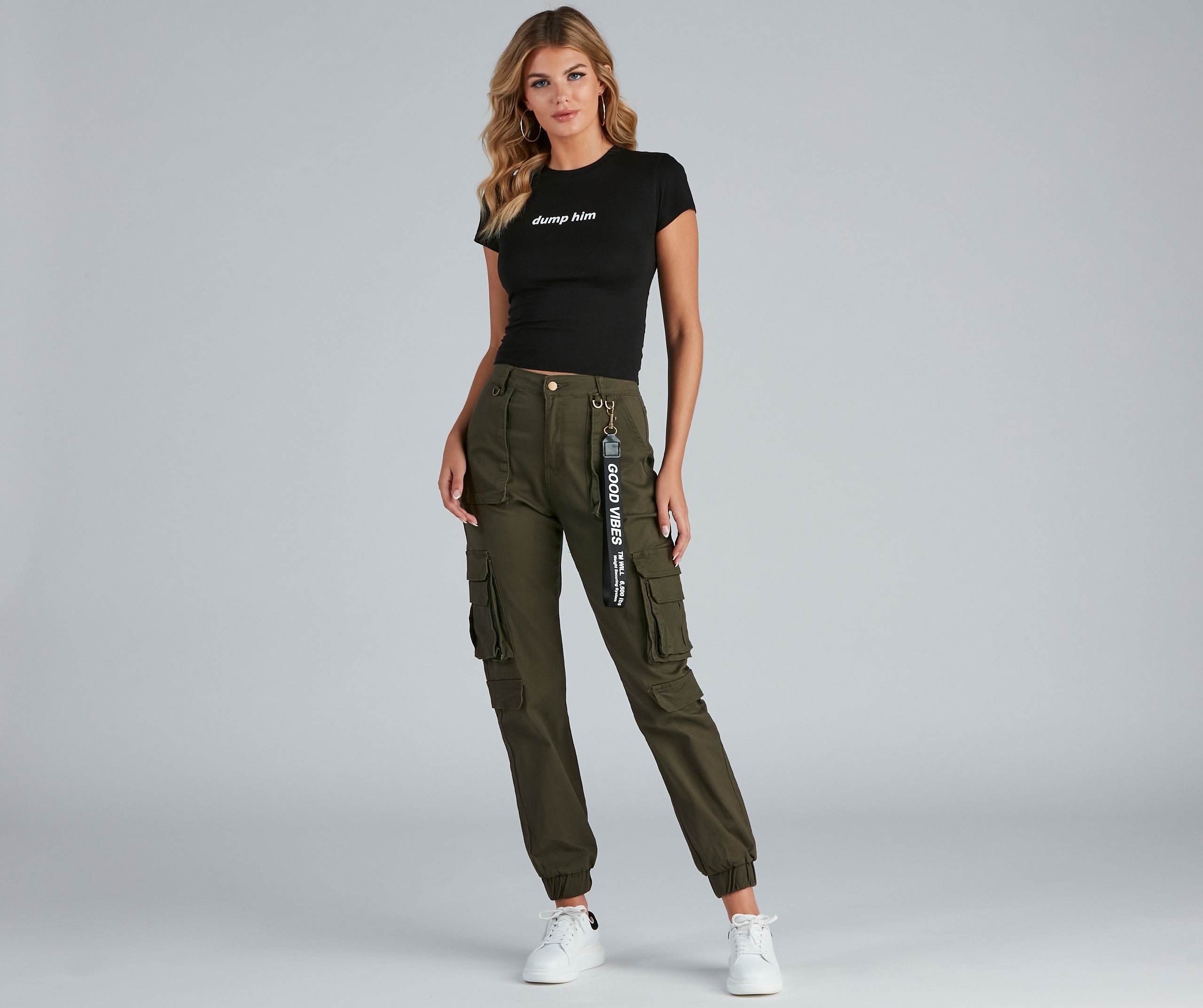 Dump him sis with a tee that gets the message across clearly! The tee features a crew neckline, short sleeves, a graphic that reads: "dump him", and a cropped hem. The tee is composed of a cotton knit fabric that offers a form hugging fit with a moderate stretch. Complete look with high waist jeans and