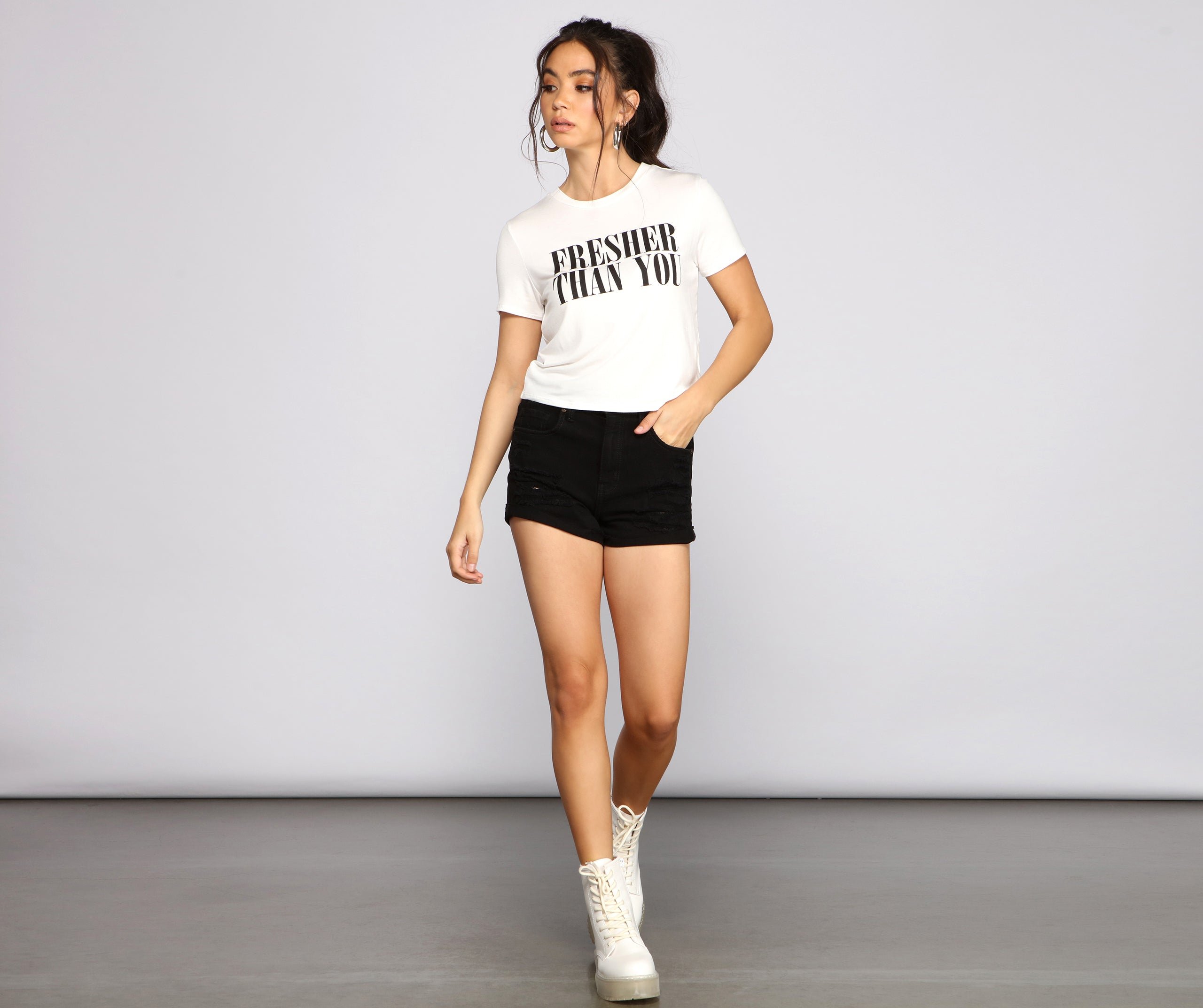 Girl, pull off a mad fresh look with a tee that says it all! Rock this graphic tee that features a crew neckline, short sleeves, and a graphic that reads: "Fresher Than You". Complete look with?