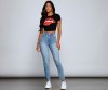 It will be love at first bite with this fun graphic tee! The top features a crew neckline, short sleeves, a cropped, form-hugging fit, and a center lips with fangs graphic. Style this sassy and spooky tee with