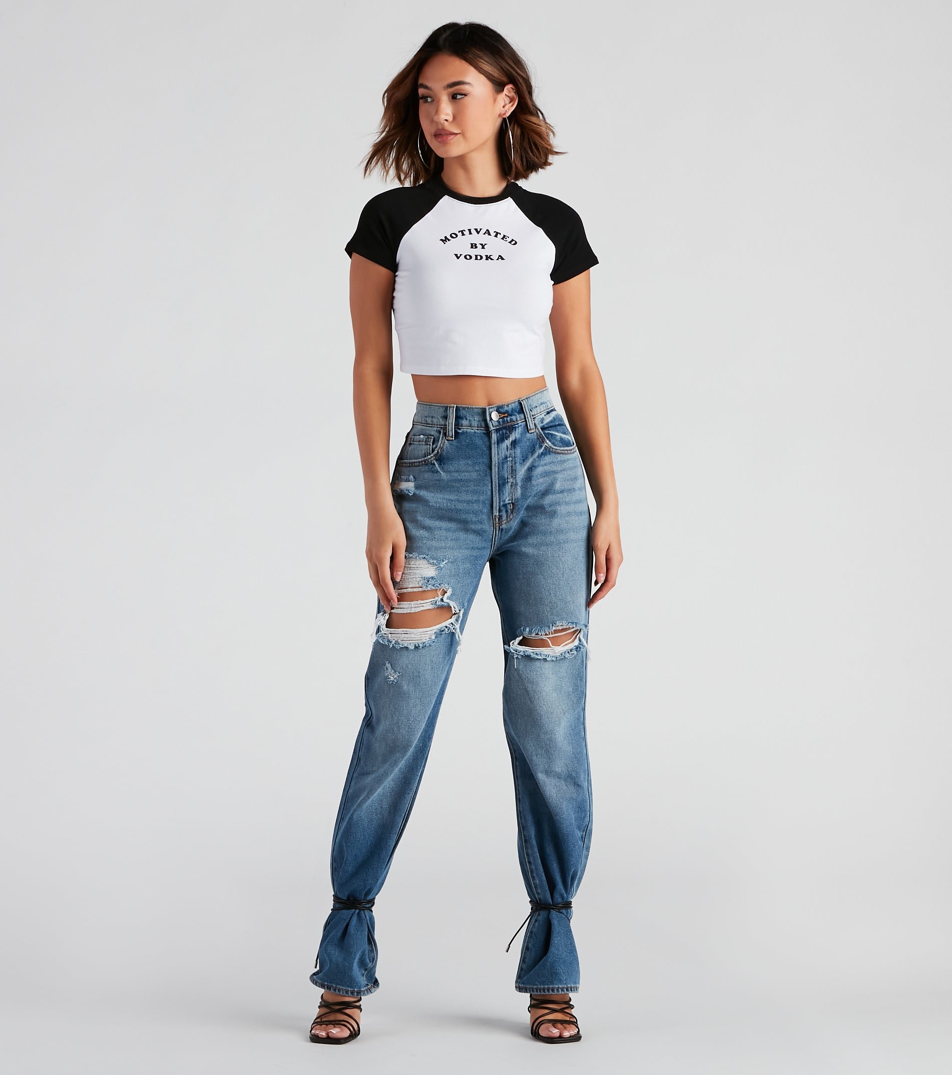 This graphic tee says it all. Show up to the party in this raglan crop top featuring cap sleeves, a crew neck, and a front script that reads, "Motivated By Vodka" crafted from cotton-blend fabric. Complete the look in distressed mom