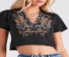 Create an edgy-glam look perf for concerts with this embellished graphic tee! It features a crew neckline with a V-cut design with layered chain trims and safety pin accents, short sleeves, a front motorcycle and wings graphic with the script "Motor City," a raw-cut cropped hem, and a relaxed fit. The cotton-blend fabric offers a moderate stretch. Style with distressed denim shorts and
