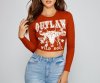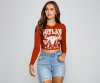 Start some trouble in a crop top that says it all! The crop top features a crew neckline, long sleeves, a graphic that reads: "Outlaw, Wild Soul", an image of a bull with longhorns, an open back with lace-up ties, and a cropped hem. The top is composed of a ribbed knit fabric that offers a form hugging fit with a moderate stretch. Complete look with high waist shorts and