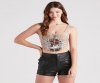 Take on the persona of an edgy rock and roll babe with this trendy graphic tank! It features a sleeveless scoop neck and back, thin tank shoulder straps, a guitar, roses, and wings graphic with the script, "Hard Rock Festival," and "Rock & Roll," and a fitted, cropped hem. Style this faux suede tank with