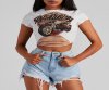 Have a total rocker babe moment in this cropped graphic tee that is perf for festival season. It features a crew neckline, short sleeves, a center motorcycle graphic with the script "Rockabilly, Wild Rock And Roll Kicks!," and a cropped, relaxed fit with slashed detailing at the hem. Style this tee with cutoff denim shorts and