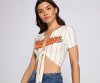 Keep it sporty and stylish with a fab tie-front top! The baseball-styled top features a plunging V-neckline, a tie-front accent, short sleeves, a graphic that reads: "Vintage" and pinstripes. Complete look with