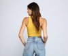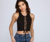 ! The top features a sleeveless crew neckline, a lace-up bodice, and a cropped hem. The top is composed of a ribbed knit fabric that offers a form hugging fit with a moderate stretch.?