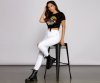 Give your look an edgy twist with a graphic tee that shows off your free-spirited side! The tee features a crew neckline, a script that reads: "Brooklyn", a motorcycle graphic with a banner that reads: "Freedom", short sleeves, slash details throughout, and a cropped hem with a twist knot accent. Complete look with high waist jeans and combat boots.?