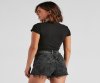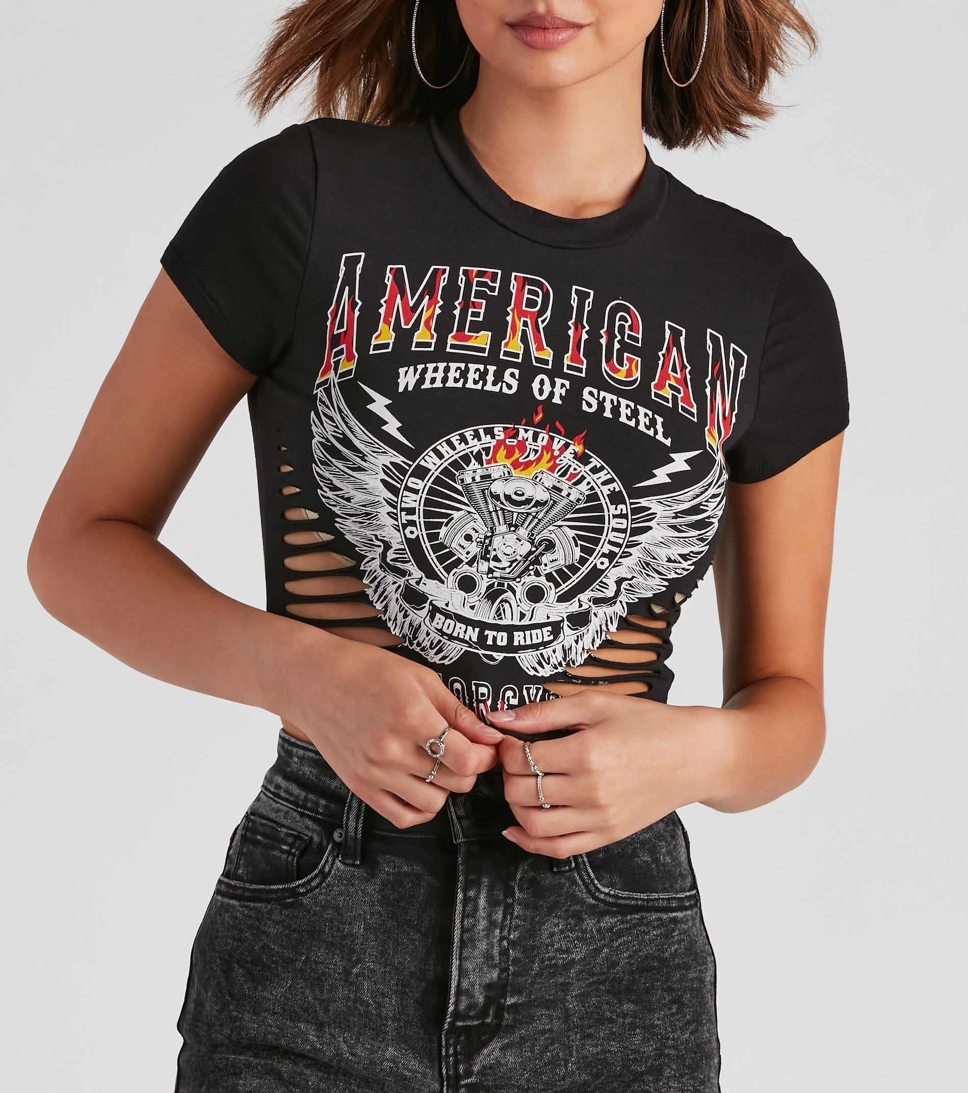 Create an edgy-vibe that's totally electric! This graphic tee features cap sleeves, a crew neck, front graphic script that reads, "American Wheels Of Steel" with trendy slits along the cropped hem. Complete the look in distressed denim