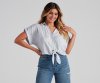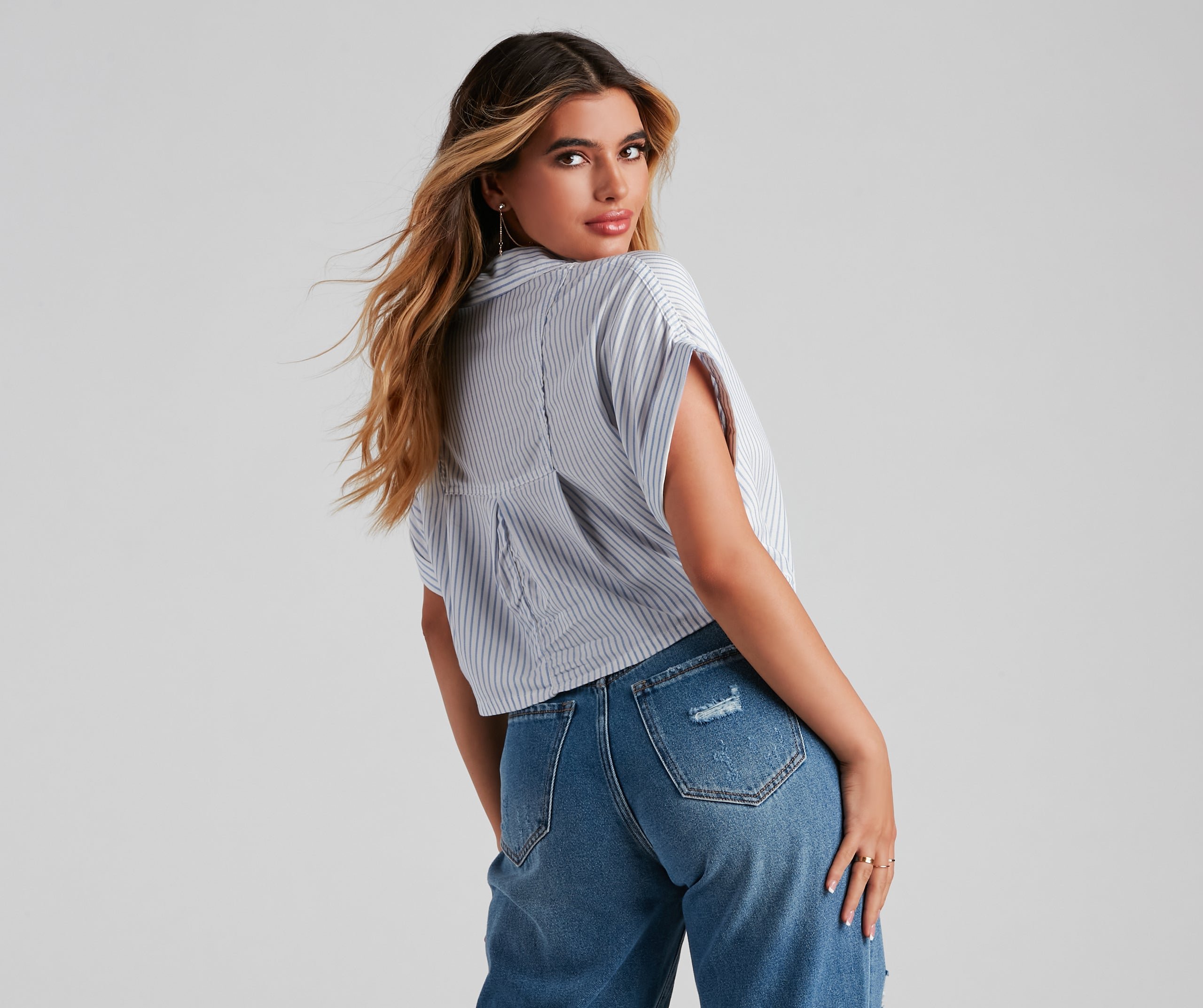 This striped linen top is perfect for a beach vacay! It features cuffed dolman short sleeves, a collared neckline, a button-down front with a pocket, and a flirty tie-knot cropped hem. Complete the look in denim