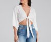 Showcase effortless vibes in this breezy tie-front top that is perfect for a beachside vacay. It features three-quarter length flowy sleeves, a tie-front design creating a V-neckline, and a cropped fit. Style with your favorite high waist bottoms and