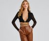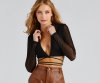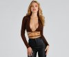 Take your style up to bold heights with this chic long sleeve top! It features a collared, plunge neckline with a tie wrap on the cropped hem. Composed of a mesh-lined knit fabric with a moderate stretch. Style with a bodycon
