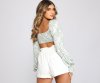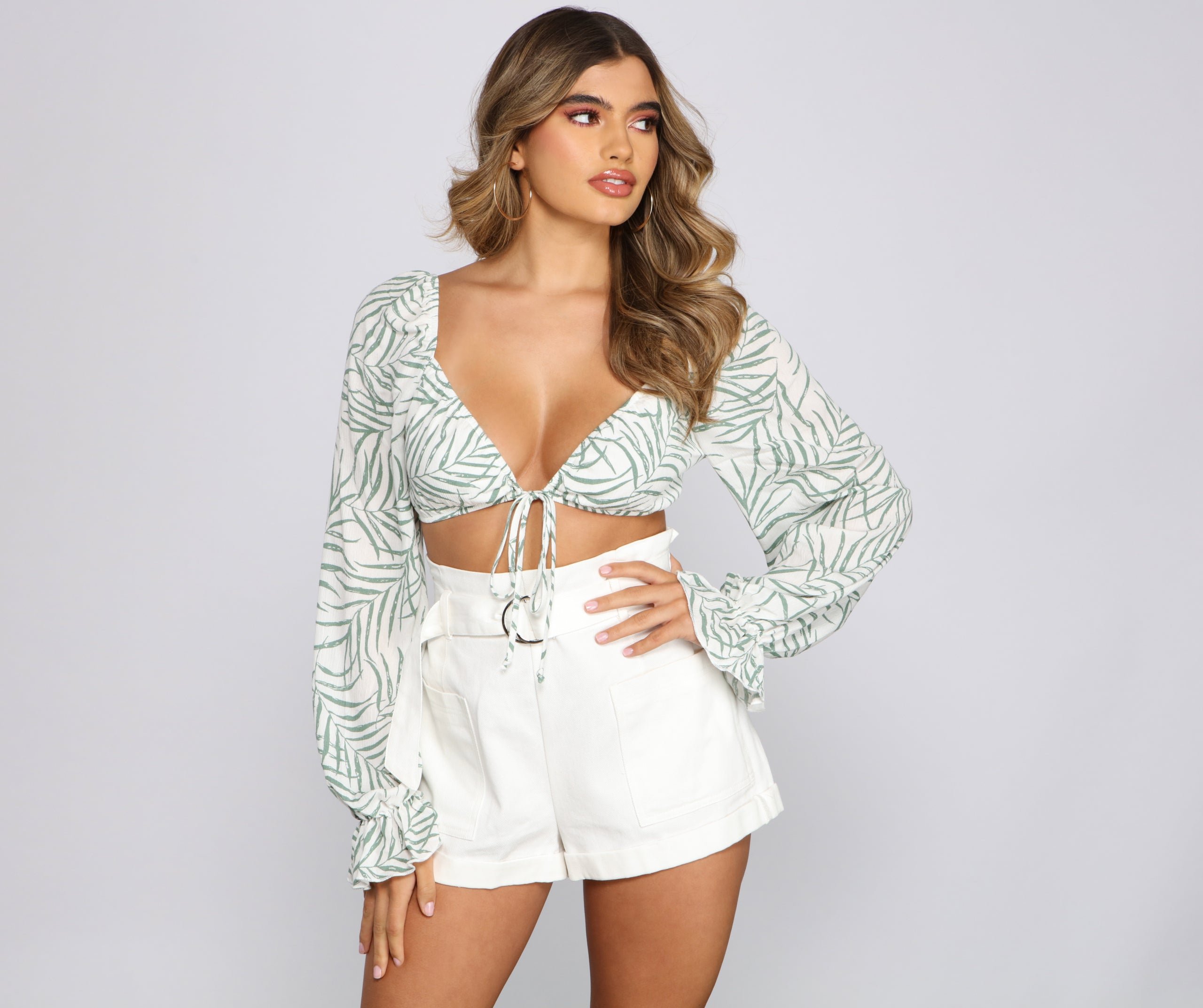Bring on those dreamy vacay vibes with this tropical printed top! It features long blouson sleeves with cinched ruffled hems, a deep V-neckline, a cute tie-front detail, and a cropped fit. The lightweight gauze fabric has a pretty tropical leaf print. Complete the look with