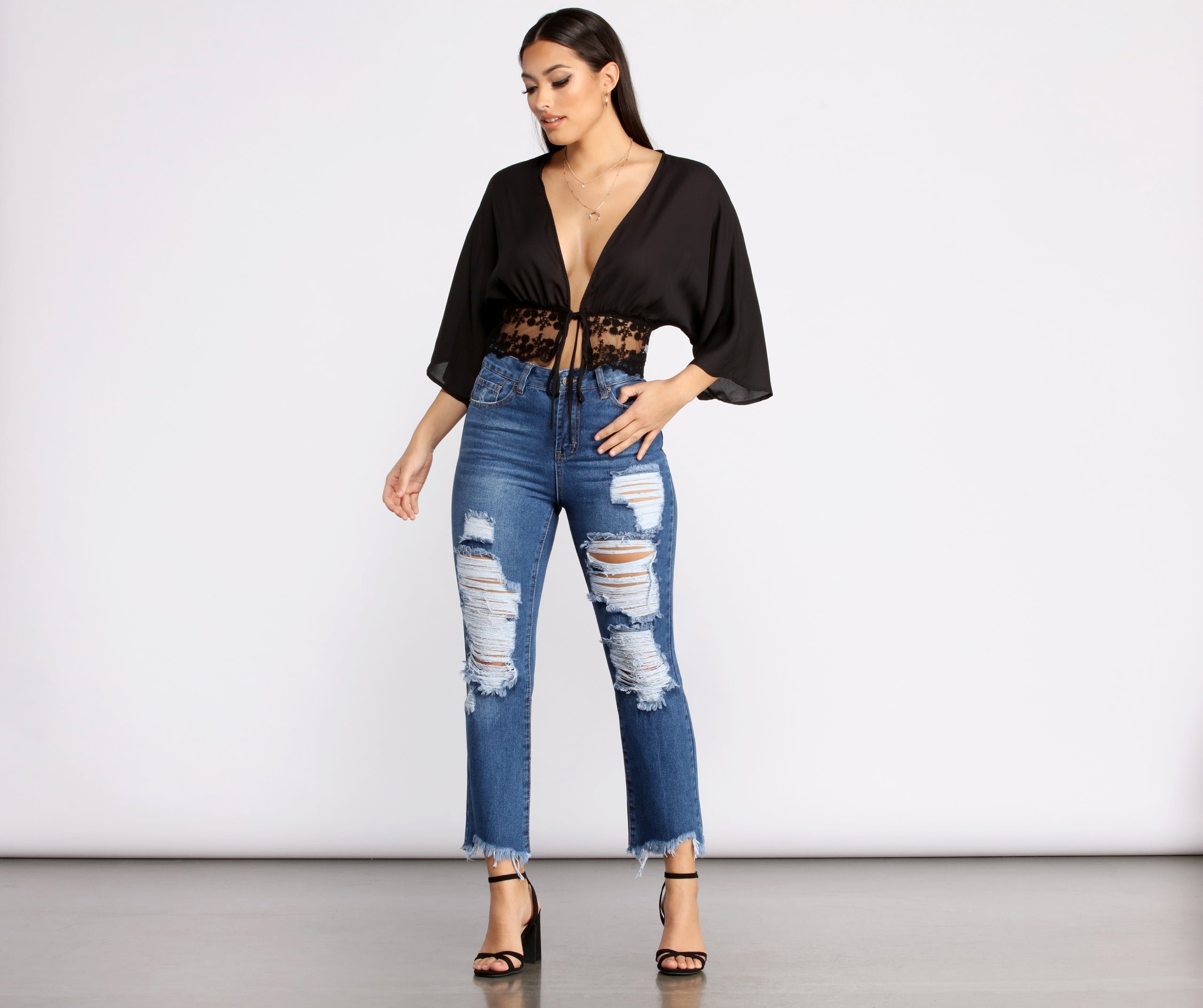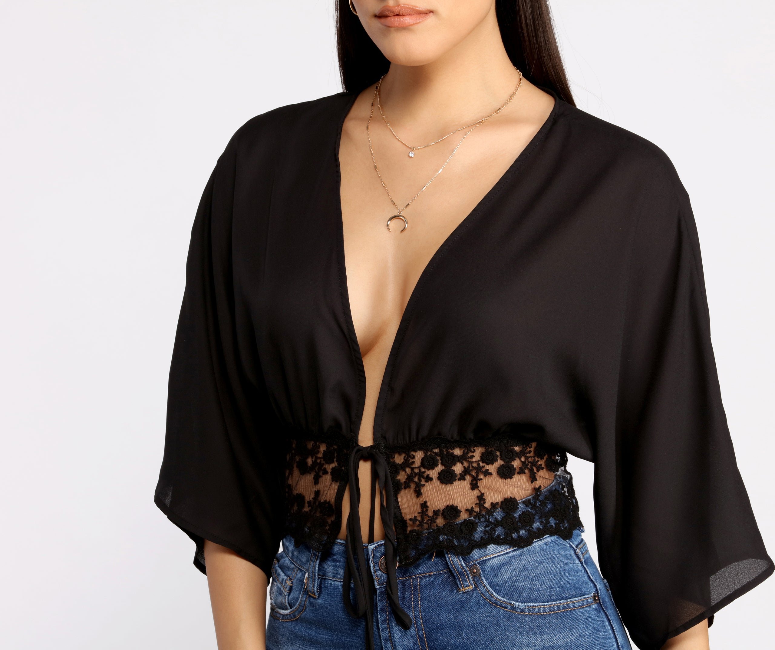 Get those effortless spring time vibes everyone is lusting after in this pretty lace detail tie front top! Pair it with some majorly destructed denim for a chic casual look!