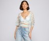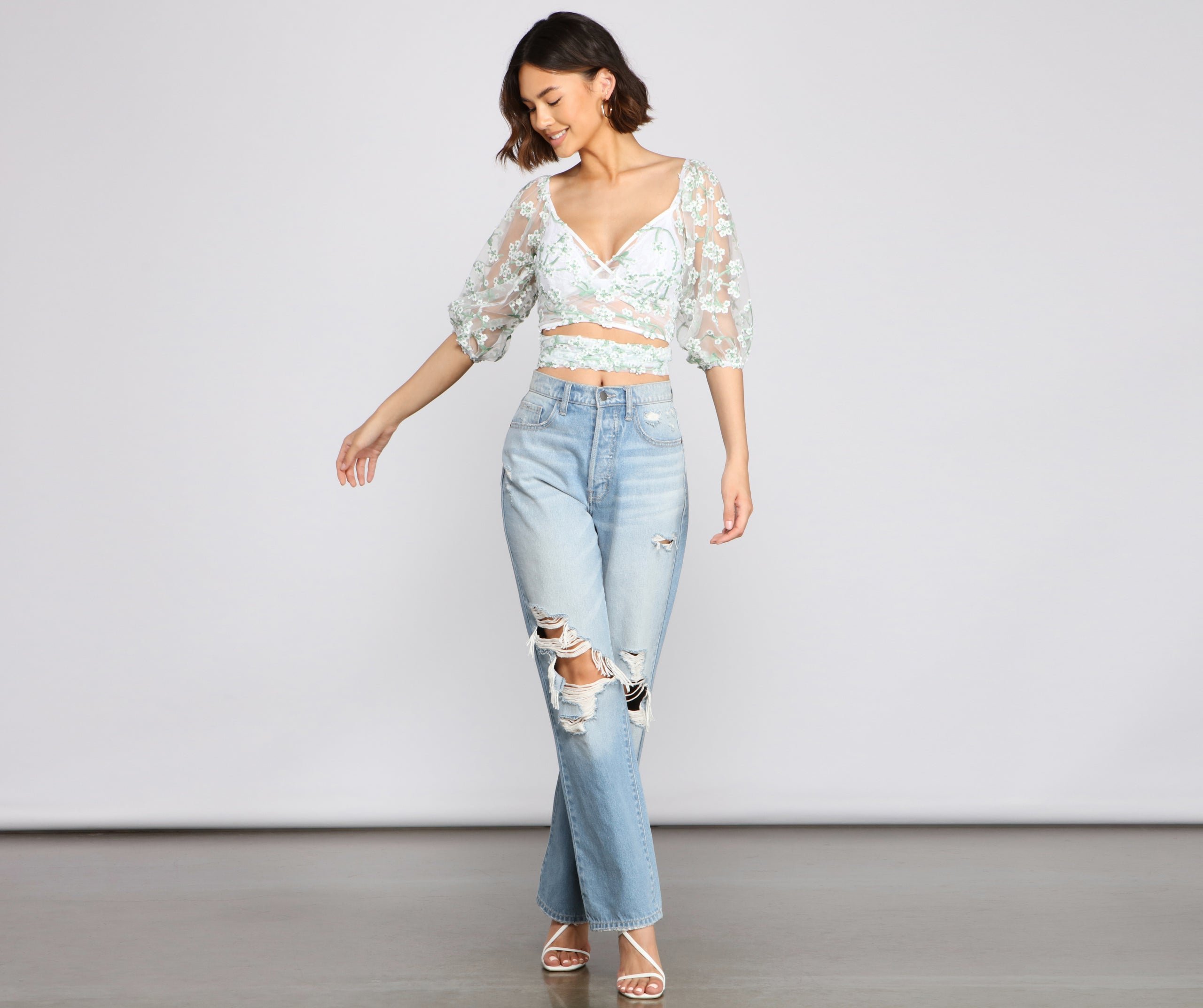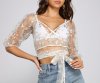 Showcase your effortless beauty in this embroidered floral crop top! It features half-length puff sleeves, a wrap-front design with a V-neckline, a cropped fit, and a tie accent that can be worn in the front or back. The sheer woven fabric has a dainty floral embroidered design for a sweet look. Style the top over a