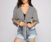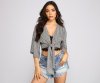 Showcase your effortless style in this tie-front top that is perf for the warmer weather. It features flowy kimono-style sleeves, a tie-front closure creating a V neckline, and a cropped fit. The lightweight woven fabric showcases a chic all-over striped pattern. Pair this top with your fave