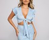 Keep it fab with a floral top that brings the charm to your look. The top features a gorge floral print, short flutter sleeves, a plunging V-neck with a cute tie-front accent, and a cropped hem. The top is composed of a brushed knit fabric that offers a relaxed fit with a moderate stretch. Complete look with the matching skirt.?