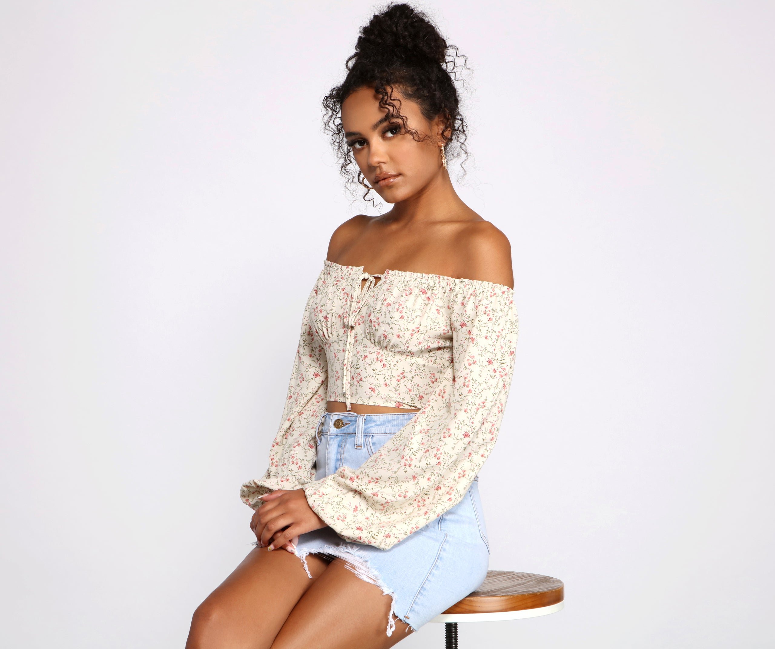 Keep it flirty in a crop top that brings the charm! The crop top features a gorgeous floral print, a square neck with a tie-front accent, long sleeves with an elastic cuff, and a cropped hem. The top is composed of a lightweight woven fabric that offers a relaxed fit with minimal stretch. Complete look with