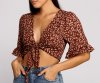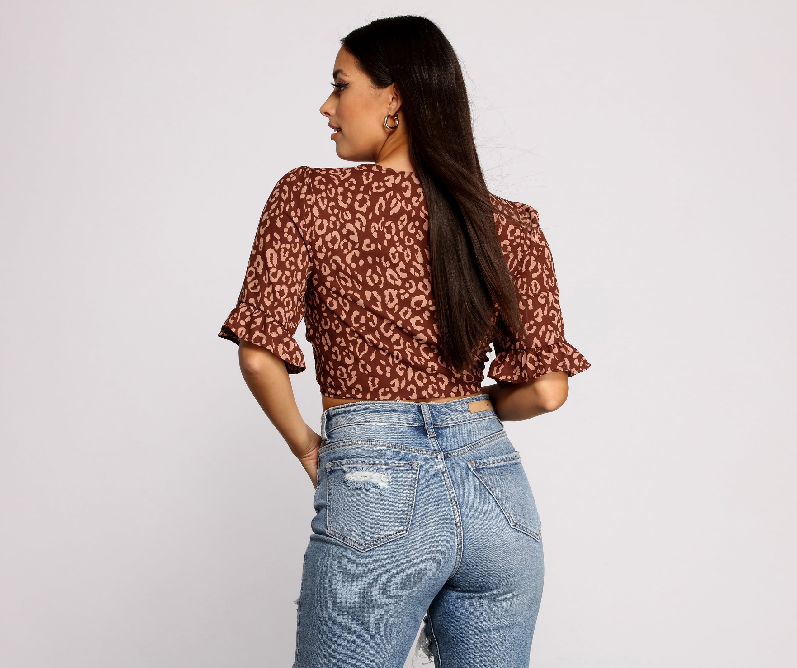 Keep it fierce in a leopard top that keeps you looking so fab! The top features a trendy leopard print, quarter-length ruffled sleeves, and a plunging tie front bodice. Complete your fab look with