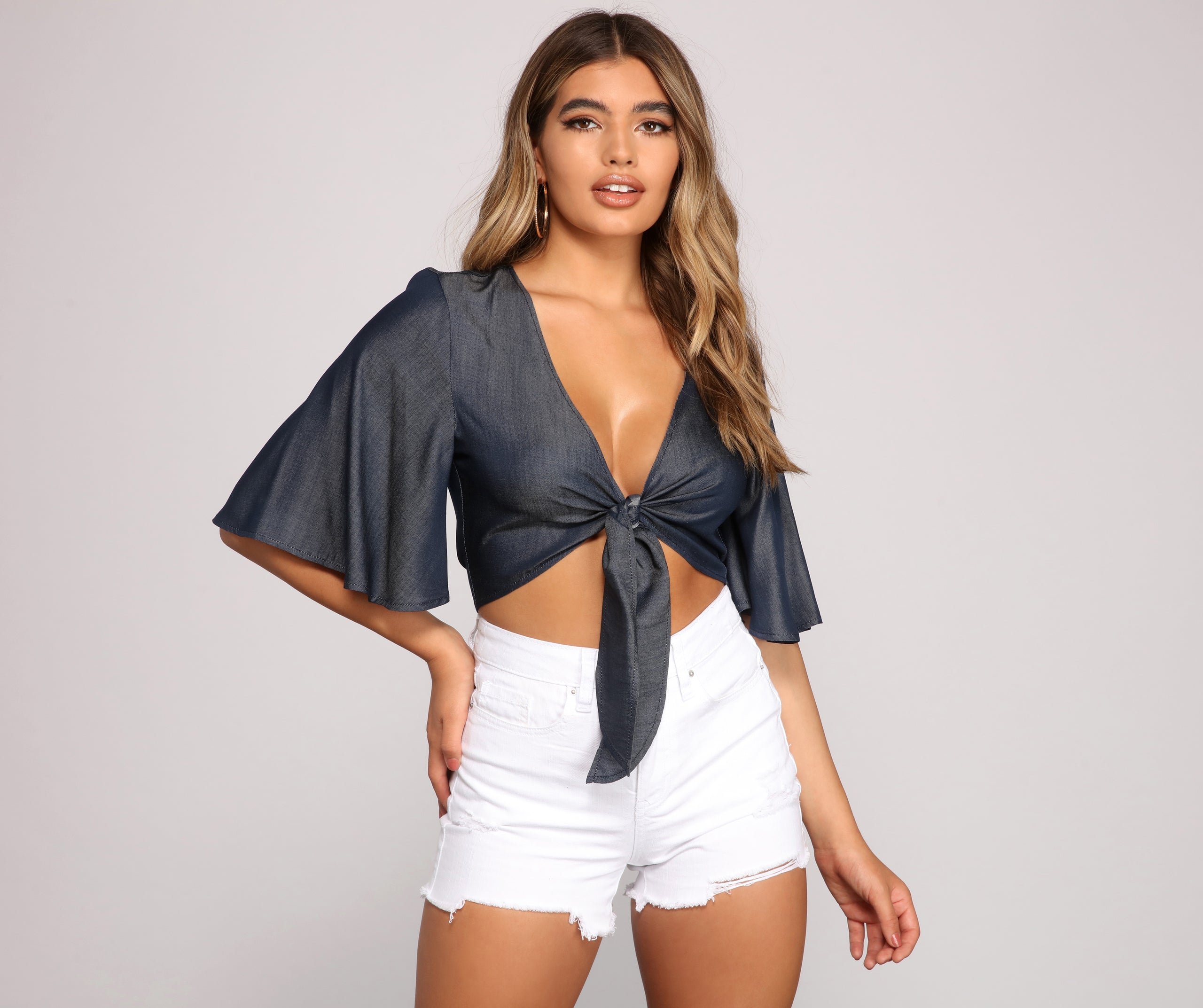 Keep it fluttery and flirty with a cute tie front top! The top features a plunging V-neckline with a tie front accent, kimono sleeves, and a cropped hem. Complete look with