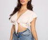 Create a flirty impression in this crop top that brings the charm! The top features a V-neckline with a tie front bodice, short flutter sleeves, and a cropped hem. The top is composed of a gauze fabric that offers a form hugging fit with a minimal stretch. Complete look with