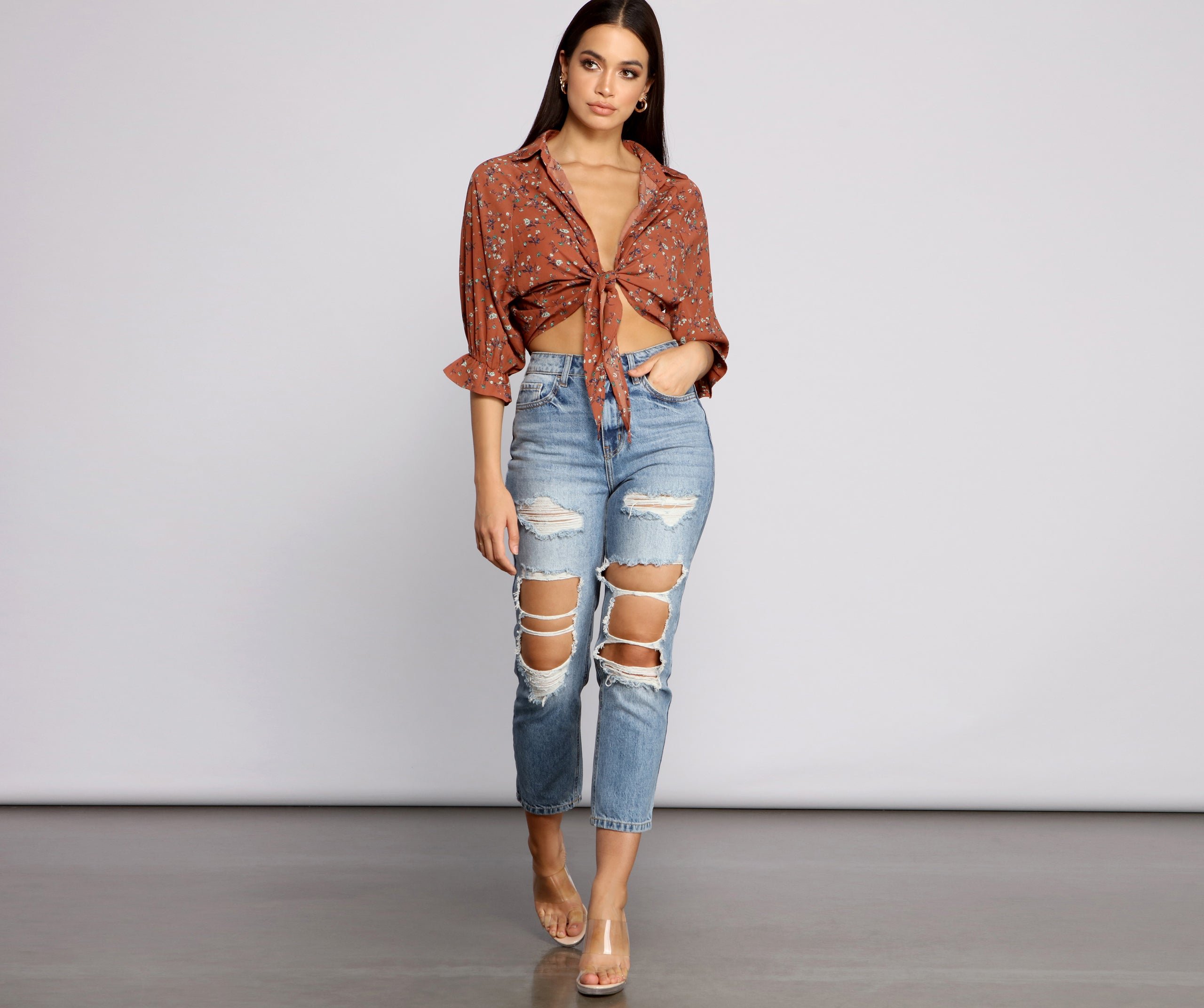 Bring the charm in this adorable top! The top features a gorge floral print, a tie front bodice, quarter length sleeves with a ruffled cuff, and a cropped hem. The top is composed of a lightweight woven fabric that offers a relaxed fit with minimal stretch. Complete look with