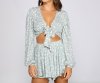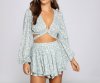 Show off your desire for florals in a stunning crop top! The top features a ditsy floral print, a plunging V-neckline, a tie-front accent, long sleeves, and a cropped hem. The top is composed of a gauze knit fabric that offers a relaxed fit with minimal stretch. Complete look with the matching shorts.