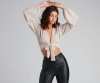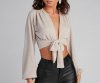 Go for the glow with a tie front top that makes a dazzling impression. The top features a plunging V-neckline, a tie-front hem, long sleeves, and a cropped hem. The top is composed of a glitter knit fabric that offers a form hugging fit with a moderate stretch. Complete look with