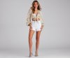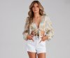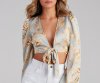 You'll be the golden girl when it comes to style! Create a sultry look in this tie-front top featuring long peasant sleeves, a plunge v-neckline, floral pattern, and a cropped hem. Complete the look in a cute mini