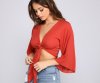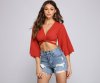 Stay on trend with a top that is perf for those snap-worthy moments! The top features a plunging tie-front, kimono sleeves, and a cropped hem. The top is composed of a gauze knit fabric that offers a relaxed fit with minimal stretch. Complete look with high waist shorts and