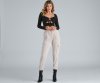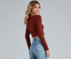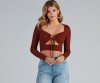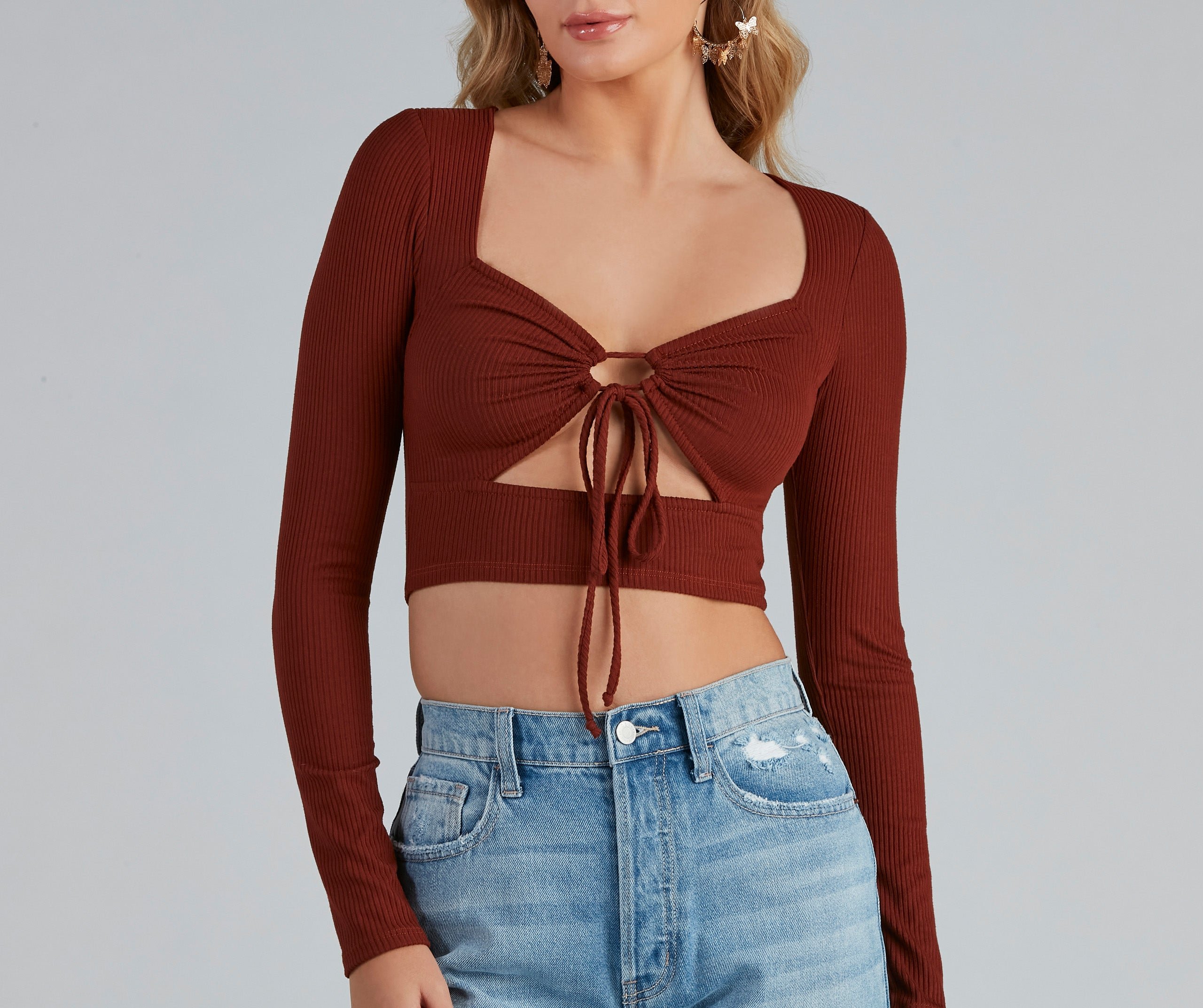 Babe, you've never looked better! Slay in a top that features a plunging sweetheart neckline, long sleeves, a center drawstring that creates a trendy O-ring, a cutout at the midriff, and a cropped hem. The top is composed of a ribbed knit fabric that offers a form hugging fit with a moderate stretch. Complete look with faux leather pants and