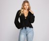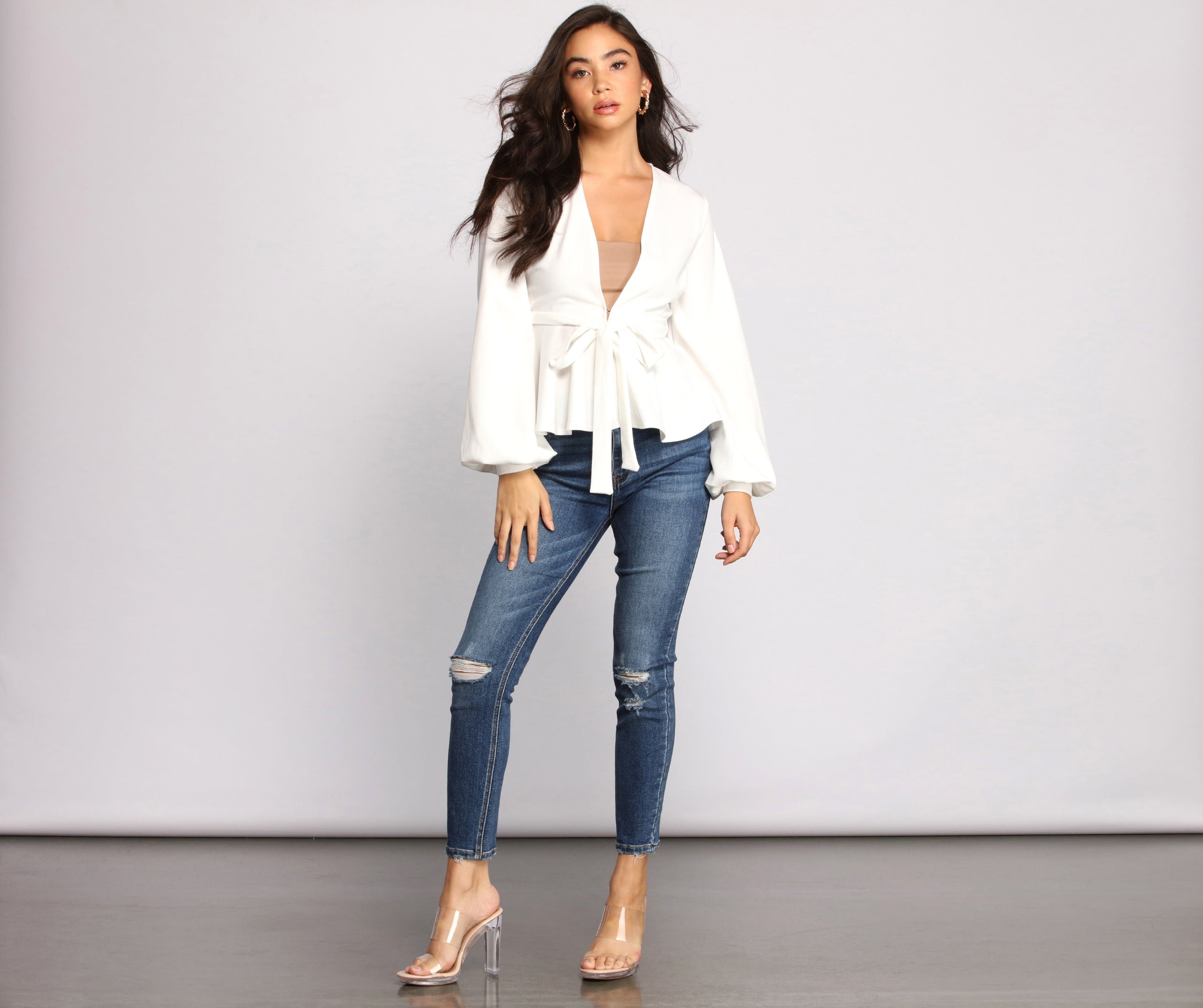 Look effortlessly pretty and poised in this chic peplum belted top! It features long billowy cuffed sleeves with an adorable tie front belt and flared peplum hem. Pair this top with