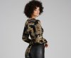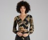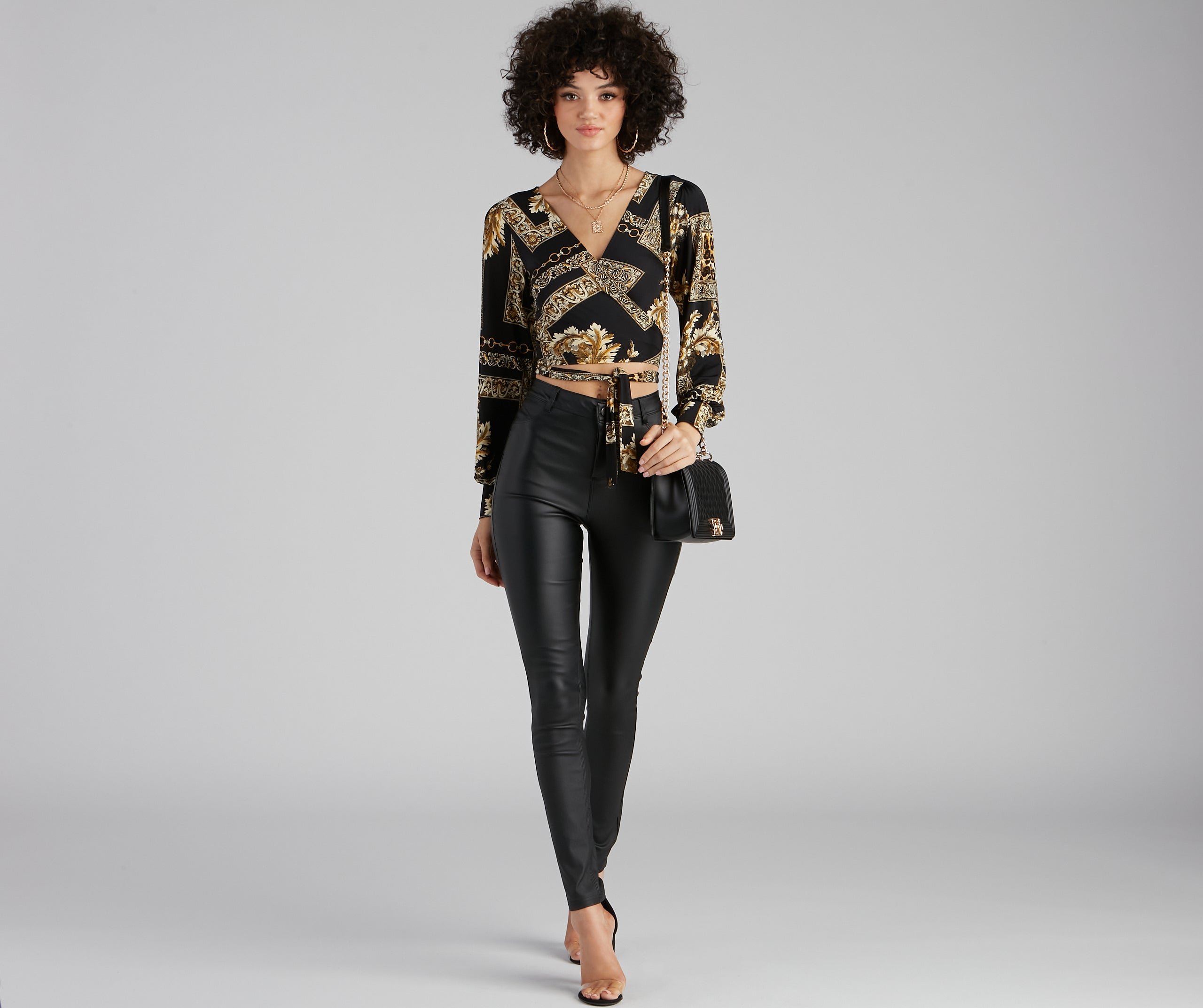 Look and feel like chic royalty in this scroll-cheetah print top. Featuring long bishop sleeves, a plunging neckline with a surplice accent, and tie-waist detail. Composed of a smooth knit fabric with a moderate stretch. Perfect for styling with f