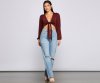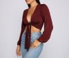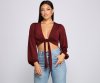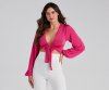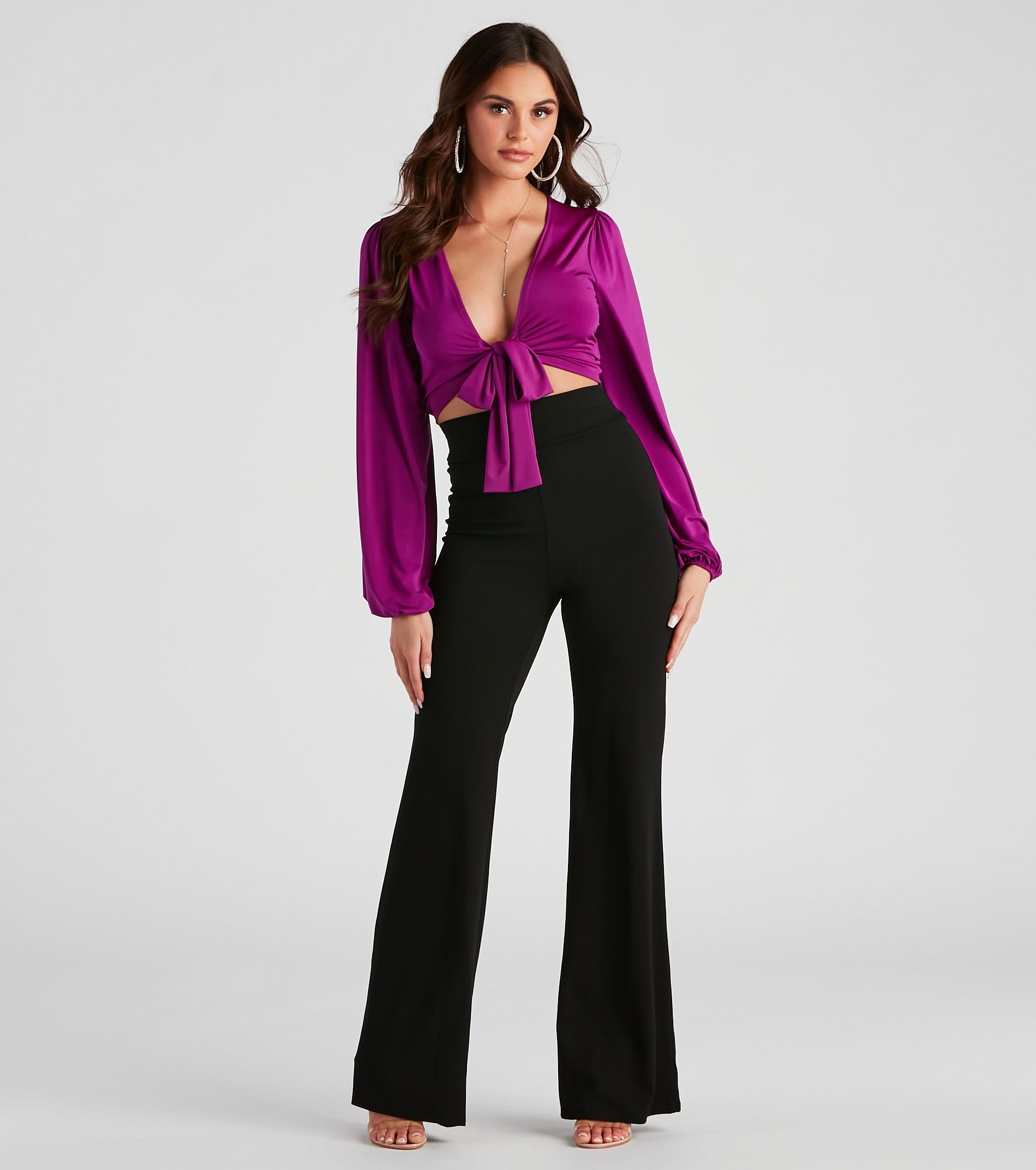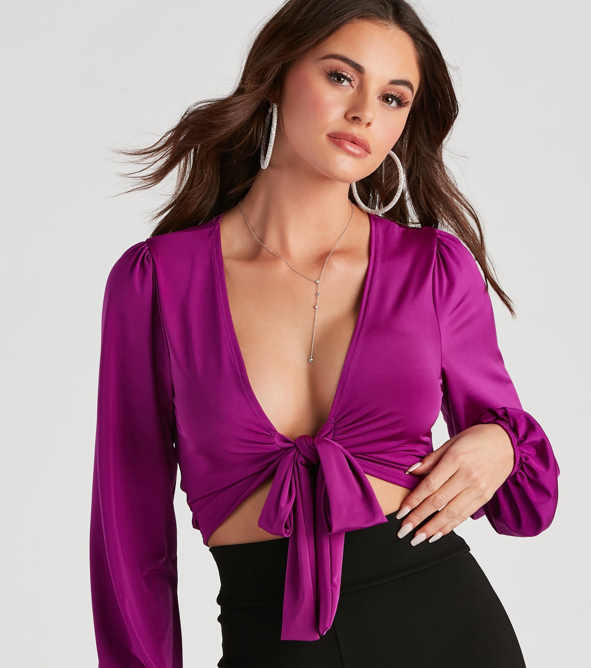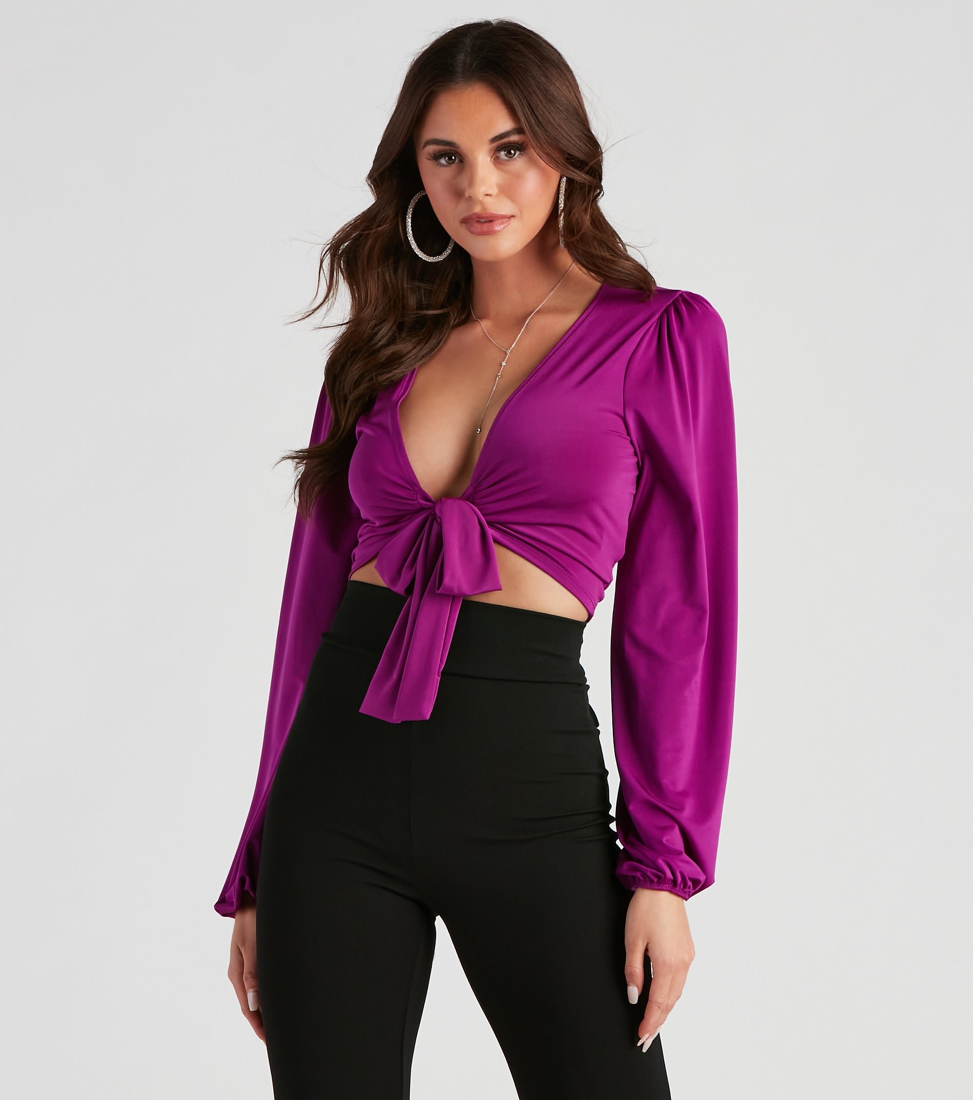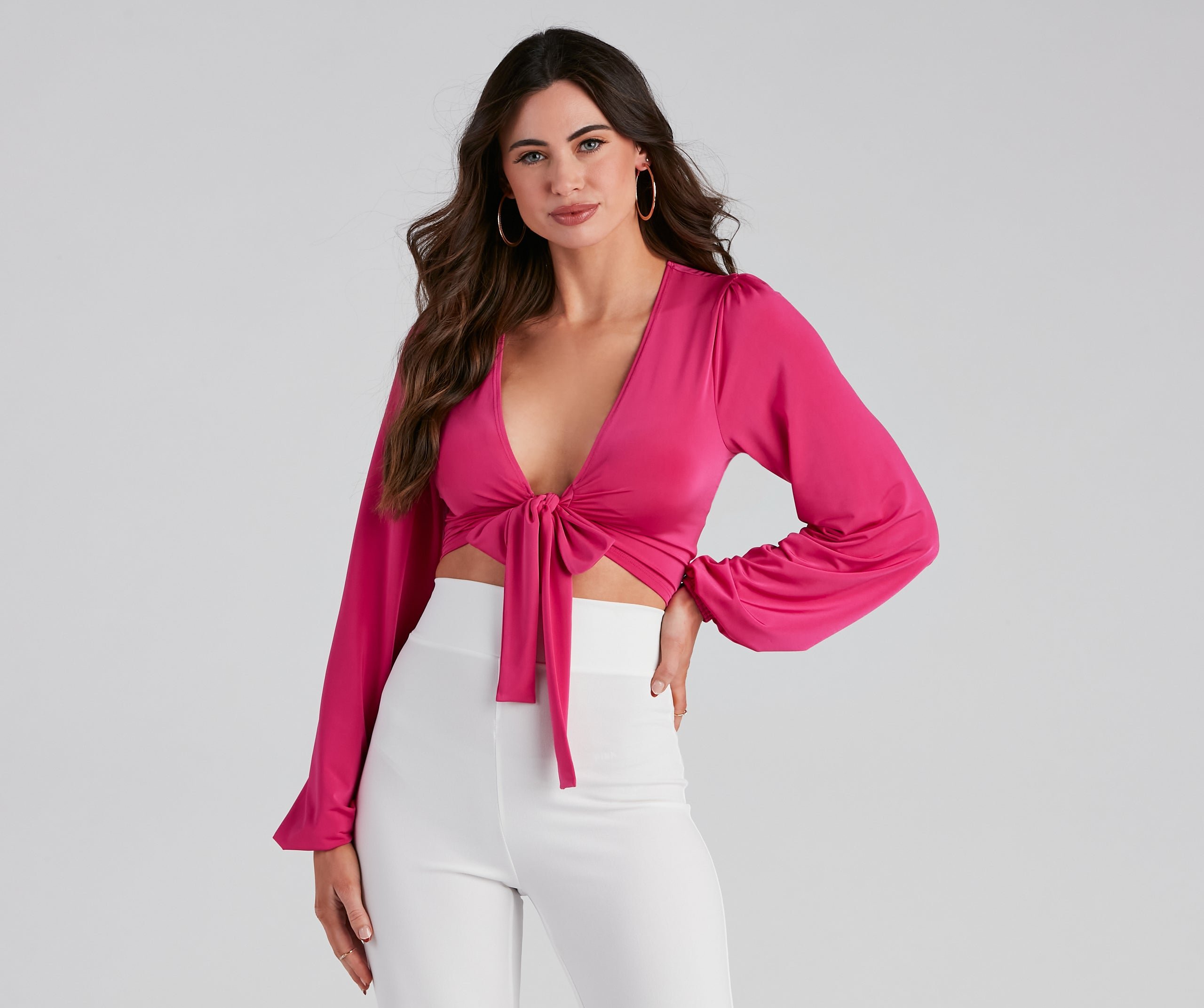 Show off your smooth style with a top that brings the sleek factor to your look! The top features a plunging V-neckline, a tie-front hem, and long sleeves with an elastic cuff. The top is composed of a smooth knit fabric that offers a form-hugging fit with a moderate stretch. Complete look with