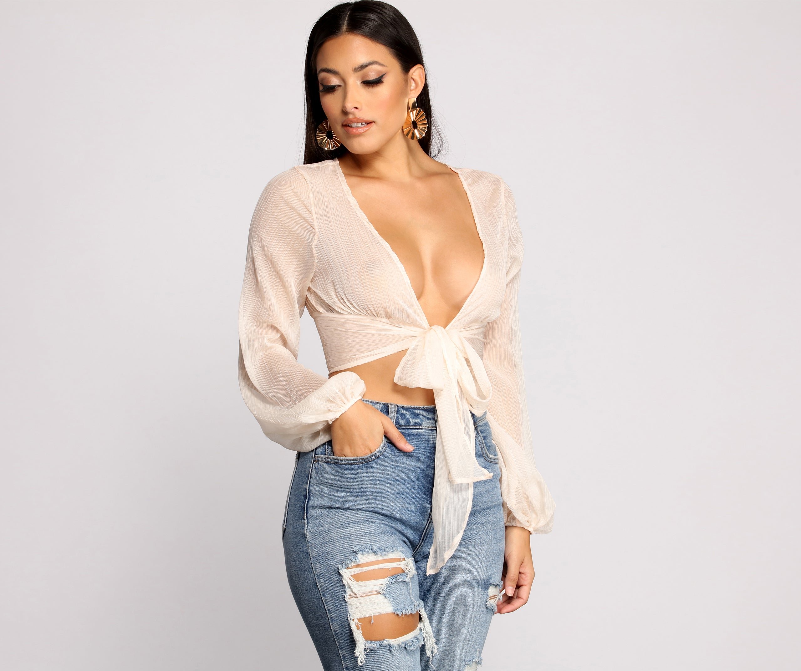 Keep it so chic in a top that stands out! The top features a plunging tie front bodice, long sleeves, and a cropped hem. The top is composed of a sheer textured lightweight woven fabric that offers a minimal stretch. Complete your look with