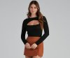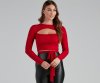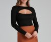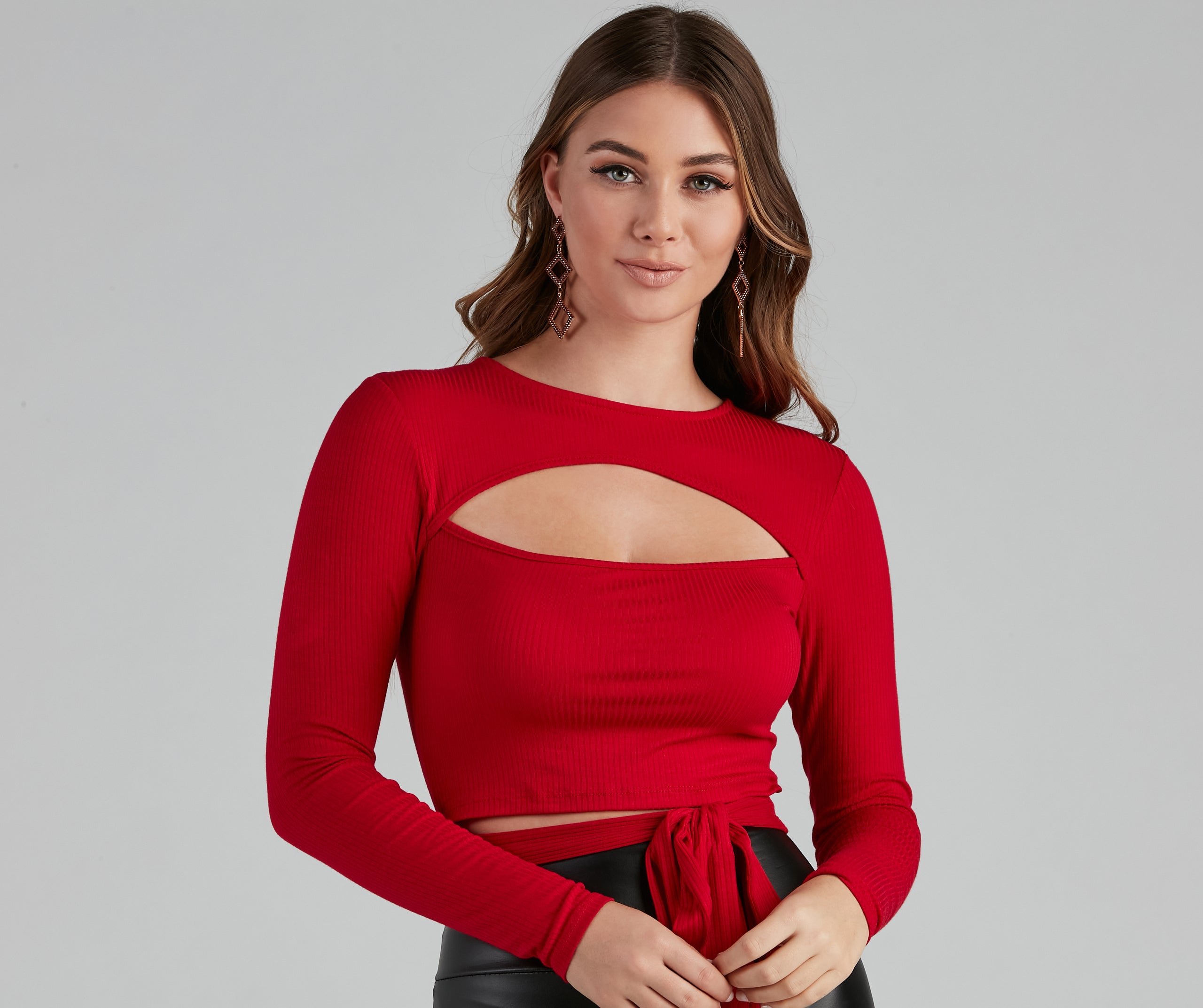 Elevate your everyday style in this long sleeve top featuring a stylish self-tie waist and a cutout detail along the crew neck. The top is composed of a soft rib-knit fabric offering a moderate stretch. Complete the look with high-rise