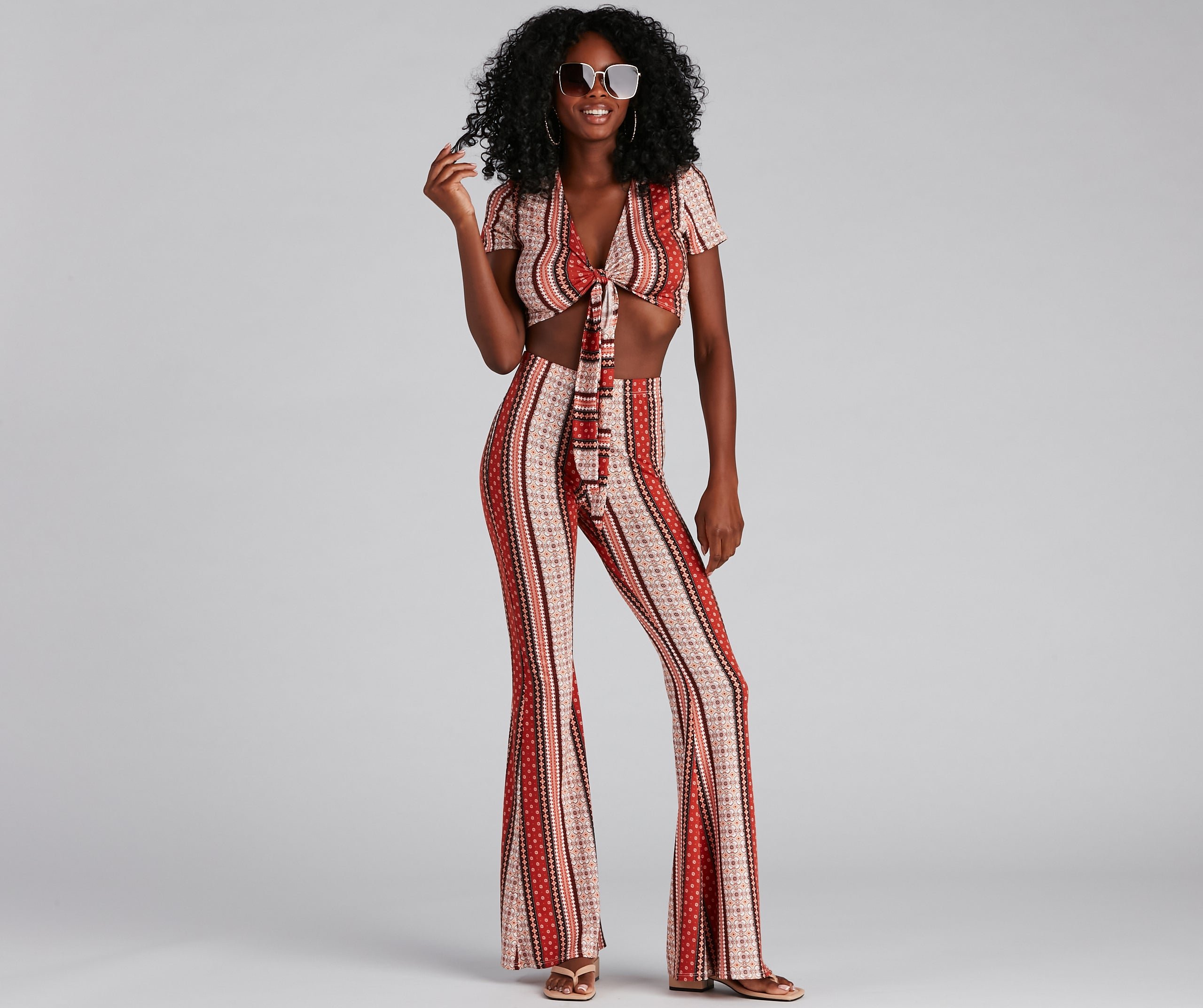 Show up with your tribe looking so boho cute! This tie-front crop top features short sleeves, a plunge v-neck, and a tribal pattern on brushed knit fabric with a moderate stretch. Style with the matching bottoms.?