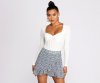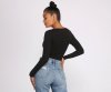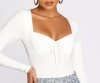 Everyone will be crushin' on you in this sweet rib knit bodysuit! It features long fitted sleeves, a flattering sweetheart neckline with a ruched bust, faux front tie detail, and a thong bottom with dual snap-button closures. Style with?