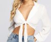 Casual chic is the way to go with this adorable tie front top. It features a long lapel collar, long sleeves with elastic cuffs, a tie front closure creating a deep V neckline, and a cropped hem. The top is composed of a lightweight, airy textured woven fabric with no stretch.