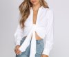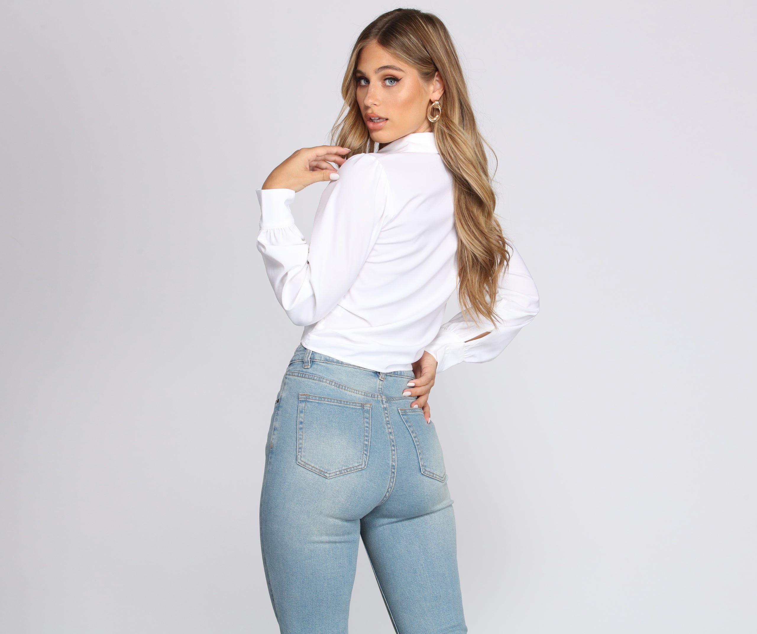 A chic twist on a classic, this top elevates an elegant wardrobe staple. Blouse features a standard collar, long cuffed sleeves with button detailing, and an open deep V front with faux tie front and front buttons, anchored by side gather detail and a modified high-low hem. Top is made from a smooth crepe material with a fair amount of stretch.