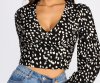 Strut your stuff with style in this trendy?blouse!?It features long sleeves with double buttons to cuff, a V neckline, a button down front, a hidden side zipper, and a cropped, fitted hem. Top is composed of a woven fabric with no stretch.