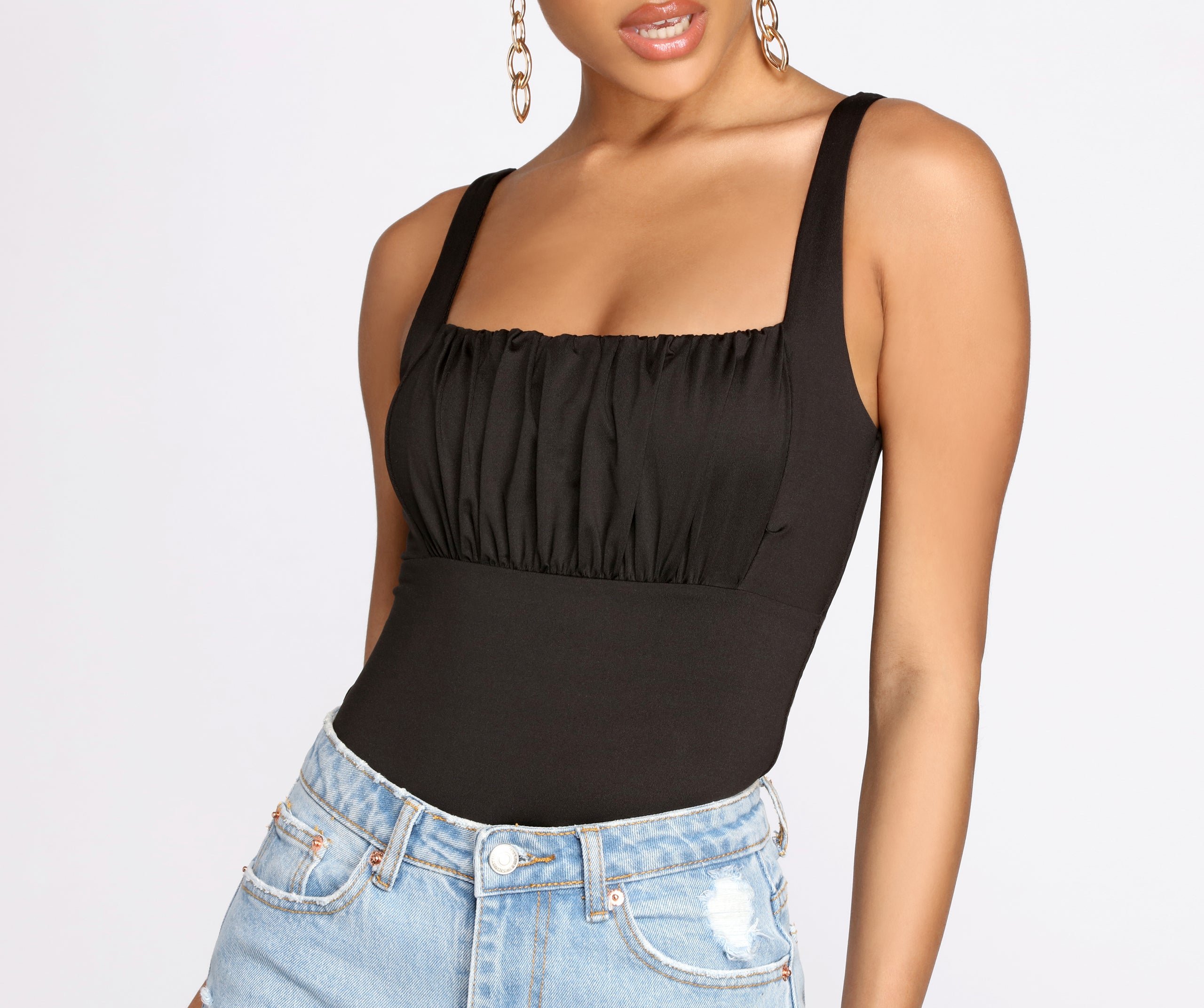 This knit bodysuit amps it up with its stylish ruched detail! Pair with some classic denim and you've got a cute 'fit babe!
